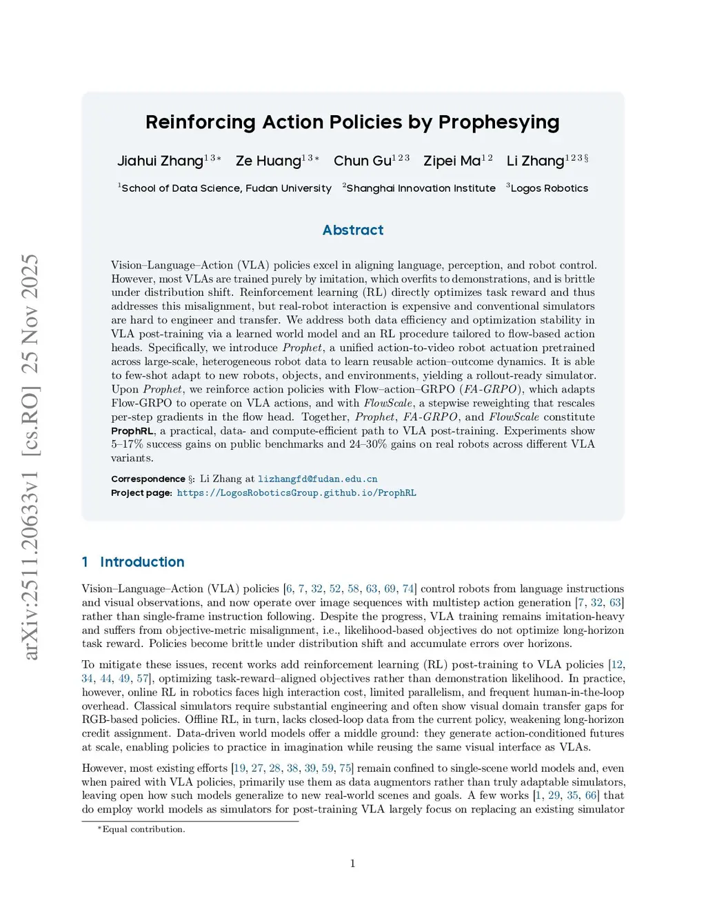 Vision-Language-Action (VLA) policies excel in aligning language, perception, and robot control. However, most VLAs are trained purely by imitation, which overfits to demonstrations, and is brittle under distribution shift. Reinforcement learning (RL) directly optimizes task reward and thus addresses this misalignment, but real-robot interaction is expensive and conventional simulators are hard to engineer and transfer. We address both data efficiency and optimization stability in VLA post-training via a learned world model and an RL procedure tailored to flow-based action heads. Specifically, we introduce Prophet, a unified action-to-video robot actuation pretrained across large-scale, heterogeneous robot data to learn reusable action-outcome dynamics. It is able to few-shot adapt to new robots, objects, and environments, yielding a rollout-ready simulator. Upon Prophet, we reinforce action policies with Flow-action-GRPO (FA-GRPO), which adapts Flow-GRPO to operate on VLA actions, and with FlowScale, a stepwise reweighting that rescales per-step gradients in the flow head. Together, Prophet, FA-GRPO, and FlowScale constitute ProphRL, a practical, data- and compute-efficient path to VLA post-training. Experiments show 5-17% success gains on public benchmarks and 24-30% gains on real robots across different VLA variants.