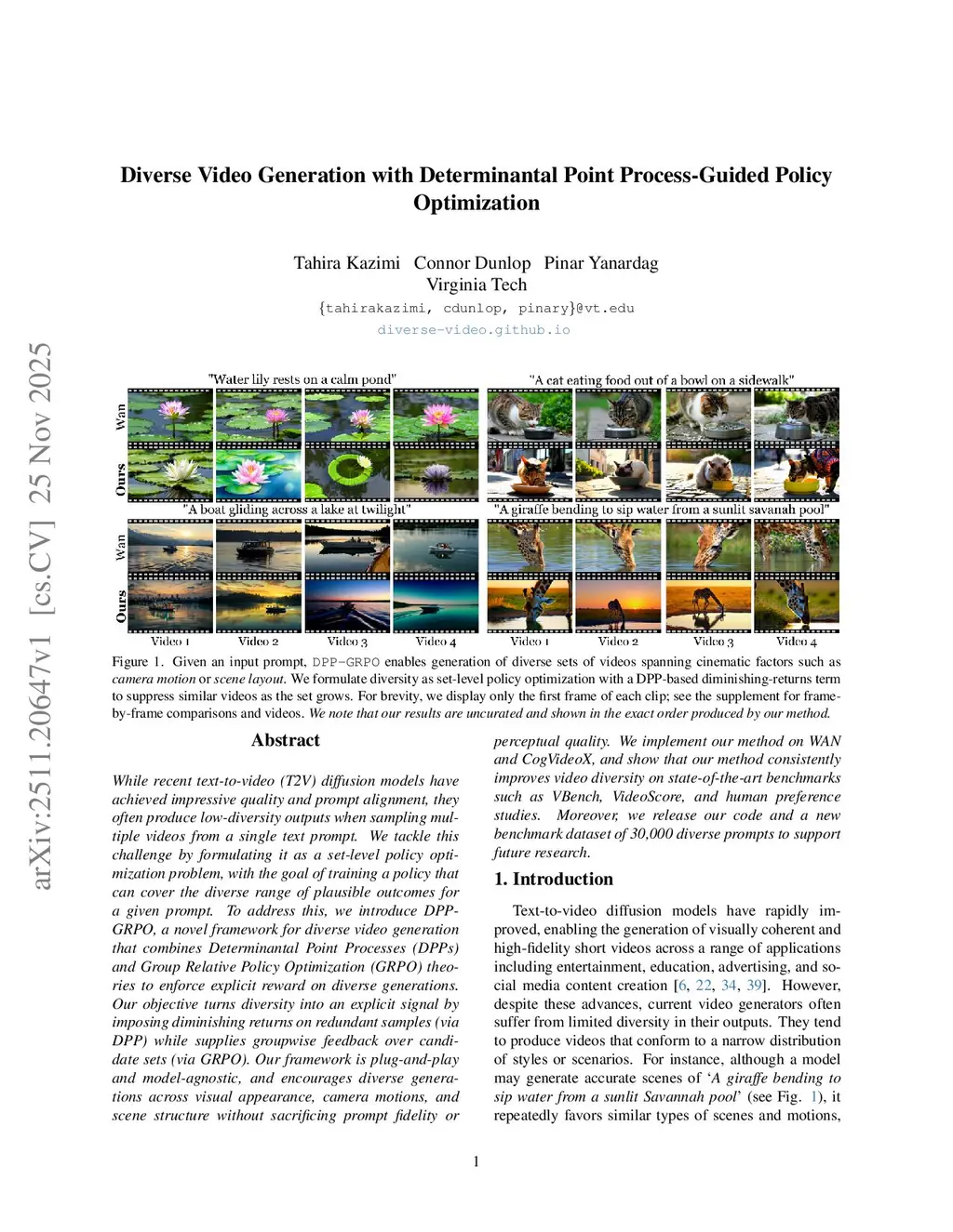 Diverse Video Generation with Determinantal Point Process-Guided Policy Optimization