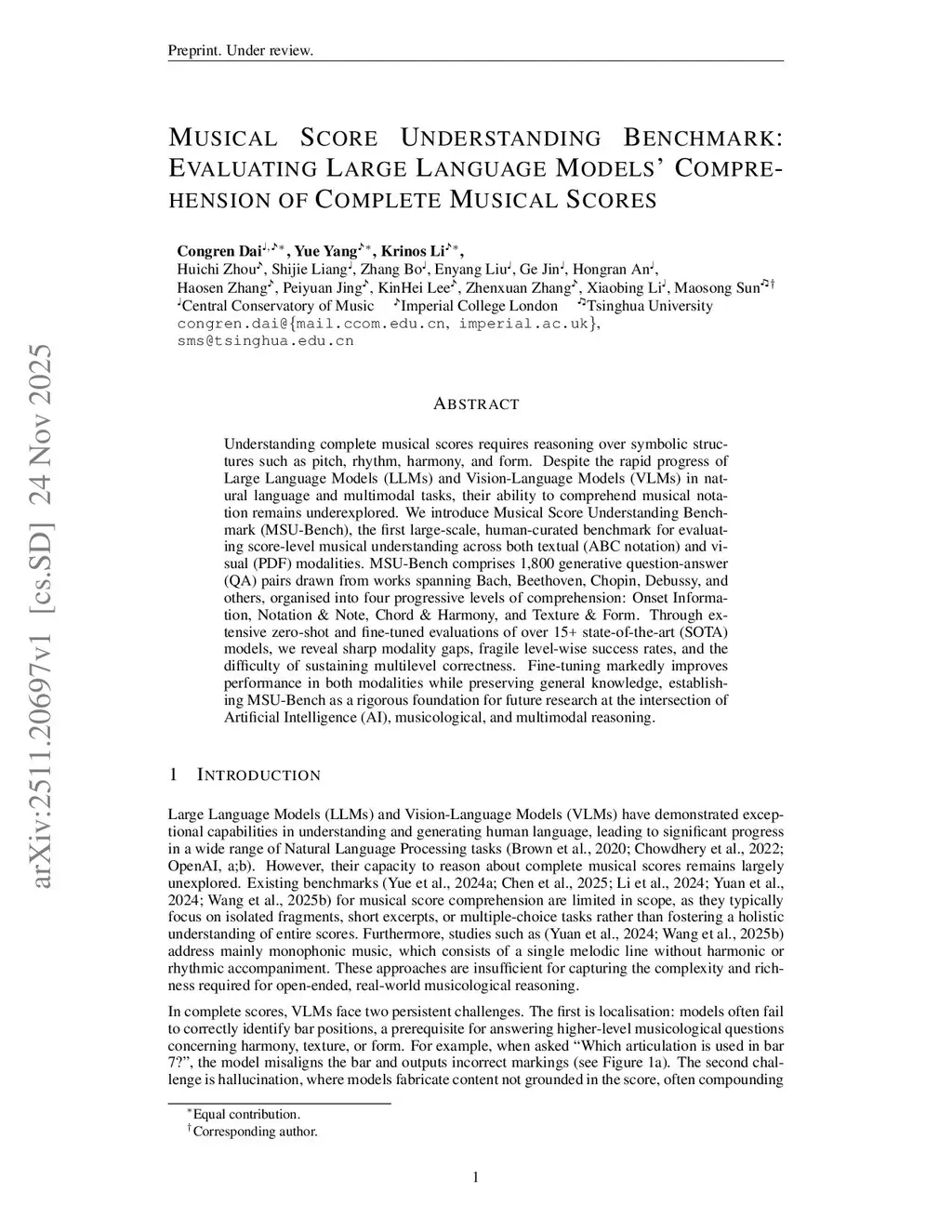 Understanding complete musical scores requires reasoning over symbolic structures such as pitch, rhythm, harmony, and form. Despite the rapid progress of Large Language Models (LLMs) and Vision-Language Models (VLMs) in natural language and multimodal tasks, their ability to comprehend musical notation remains underexplored. We introduce Musical Score Understanding Benchmark (MSU-Bench), the first large-scale, human-curated benchmark for evaluating score-level musical understanding across both textual (ABC notation) and visual (PDF) modalities. MSU-Bench comprises 1,800 generative question-answer (QA) pairs drawn from works spanning Bach, Beethoven, Chopin, Debussy, and others, organised into four progressive levels of comprehension: Onset Information, Notation & Note, Chord & Harmony, and Texture & Form. Through extensive zero-shot and fine-tuned evaluations of over 15+ state-of-the-art (SOTA) models, we reveal sharp modality gaps, fragile level-wise success rates, and the difficulty of sustaining multilevel correctness. Fine-tuning markedly improves performance in both modalities while preserving general knowledge, establishing MSU-Bench as a rigorous foundation for future research at the intersection of Artificial Intelligence (AI), musicological, and multimodal reasoning.