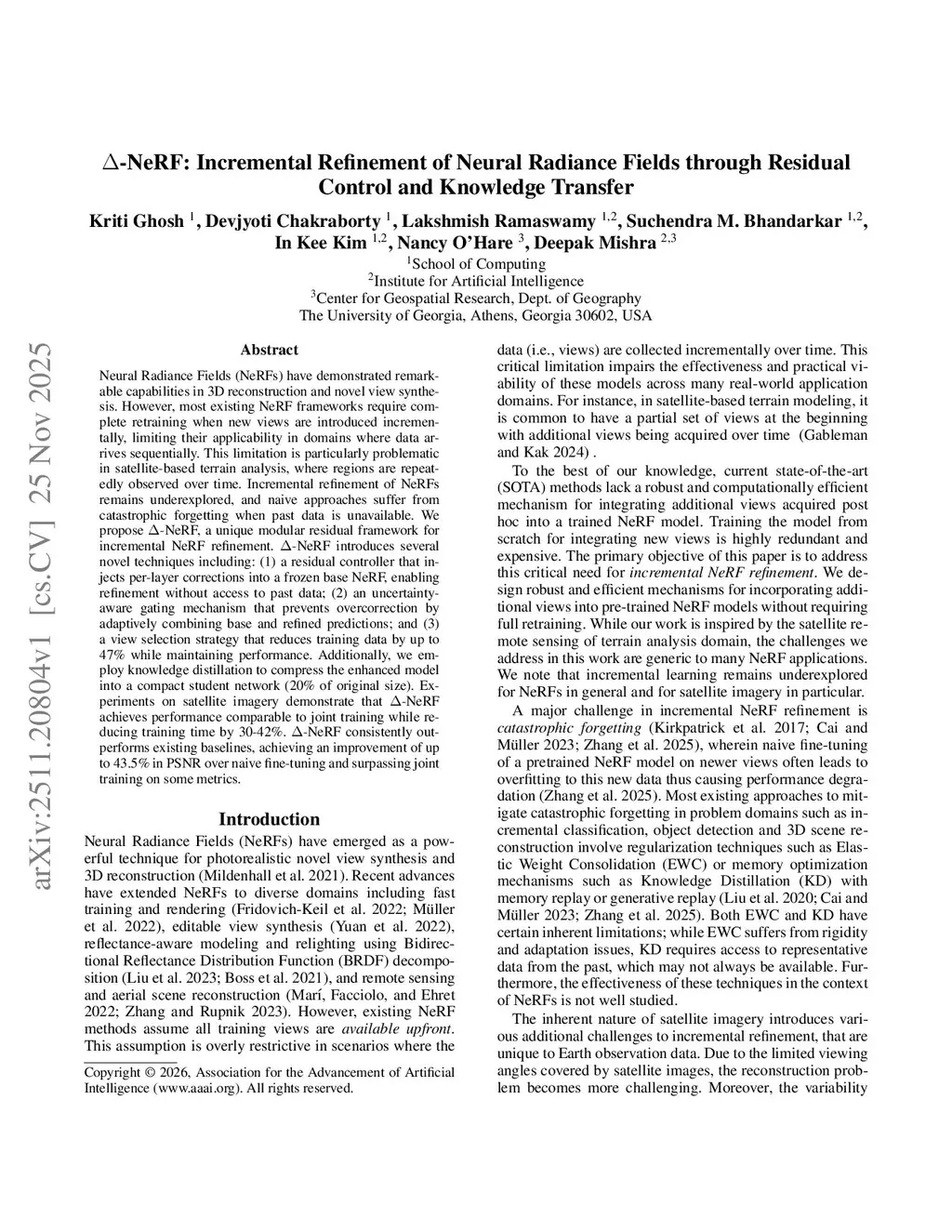 Neural Radiance Fields (NeRFs) have demonstrated remarkable capabilities in 3D reconstruction and novel view synthesis. However, most existing NeRF frameworks require complete retraining when new views are introduced incrementally, limiting their applicability in domains where data arrives sequentially. This limitation is particularly problematic in satellite-based terrain analysis, where regions are repeatedly observed over time. Incremental refinement of NeRFs remains underexplored, and naive approaches suffer from catastrophic forgetting when past data is unavailable. We propose -NeRF, a unique modular residual framework for incremental NeRF refinement. -NeRF introduces several novel techniques including: (1) a residual controller that injects per-layer corrections into a frozen base NeRF, enabling refinement without access to past data; (2) an uncertainty-aware gating mechanism that prevents overcorrection by adaptively combining base and refined predictions; and (3) a view selection strategy that reduces training data by up to 47\% while maintaining performance. Additionally, we employ knowledge distillation to compress the enhanced model into a compact student network (20\% of original size). Experiments on satellite imagery demonstrate that -NeRF achieves performance comparable to joint training while reducing training time by 30-42\%. -NeRF consistently outperforms existing baselines, achieving an improvement of up to 43.5\% in PSNR over naive fine-tuning and surpassing joint training on some metrics.