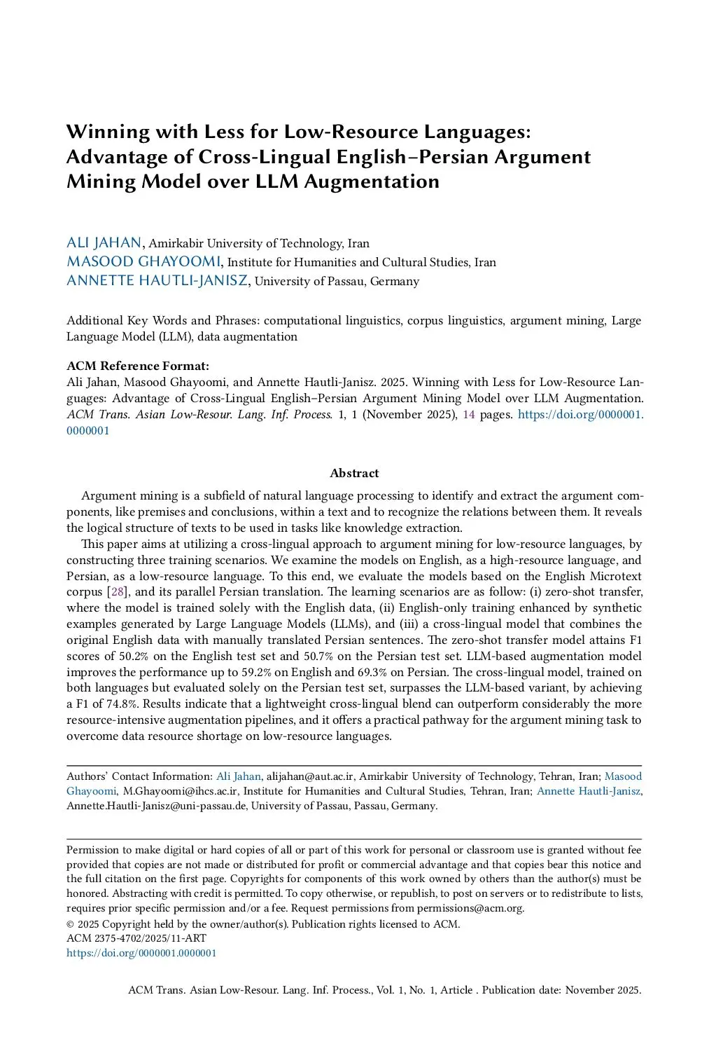 Winning with Less for Low Resource Languages: Advantage of Cross-Lingual English_Persian Argument Mining Model over LLM Augmentation