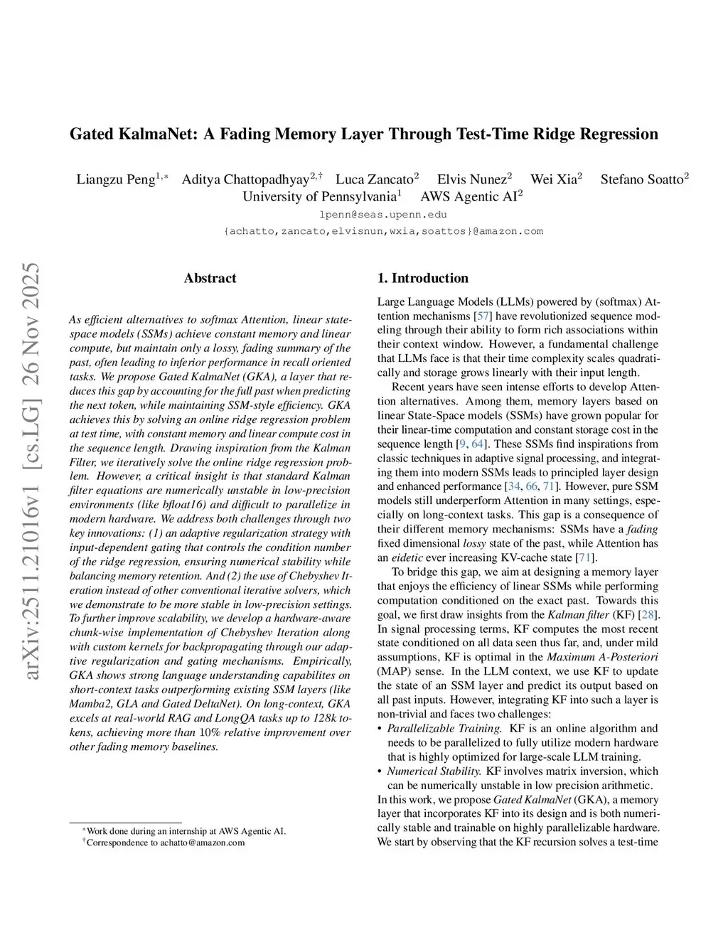 As efficient alternatives to softmax Attention, linear State-Space Models (SSMs) achieve constant memory and linear compute, but maintain only a lossy, fading summary of the past, often leading to inferior performance in recall-oriented tasks. We propose Gated KalmaNet (GKA), a layer that accounts for the full past while maintaining SSM-style efficiency. We ground our approach in the Kalman Filter (KF) framework, which provides a principled solution for optimal inference in dynamical systems. We show that several existing SSM layers (DeltaNet, Gated DeltaNet, and Kimi Delta Attention) are approximations to the KF recurrence that assume identity error covariance, thereby ignoring how past measurements (keys and values) should optimally influence state updates. In contrast, GKA computes the exact Kalman gain by maintaining the full error covariance. Under a steady-state assumption that enables parallelization, this reduces to solving an online ridge regression problem with constant memory and linear compute cost. A critical insight is that standard KF equations are numerically unstable in low-precision environments (like bfloat16) and hard to parallelize on modern hardware. We address this through: (1) adaptive regularization with input-dependent gating to control the condition number of the ridge regression for numerical stability, and (2) Chebyshev Iteration, which we show is more stable than conventional iterative solvers in low-precision settings. We further develop hardware-aware chunk-wise kernels to enable efficient training. Empirically, GKA outperforms existing SSM layers (like Mamba2 and Gated DeltaNet) on short-context tasks and achieves more than 10\% relative improvement on long-context RAG and LongQA tasks up to 128k tokens.