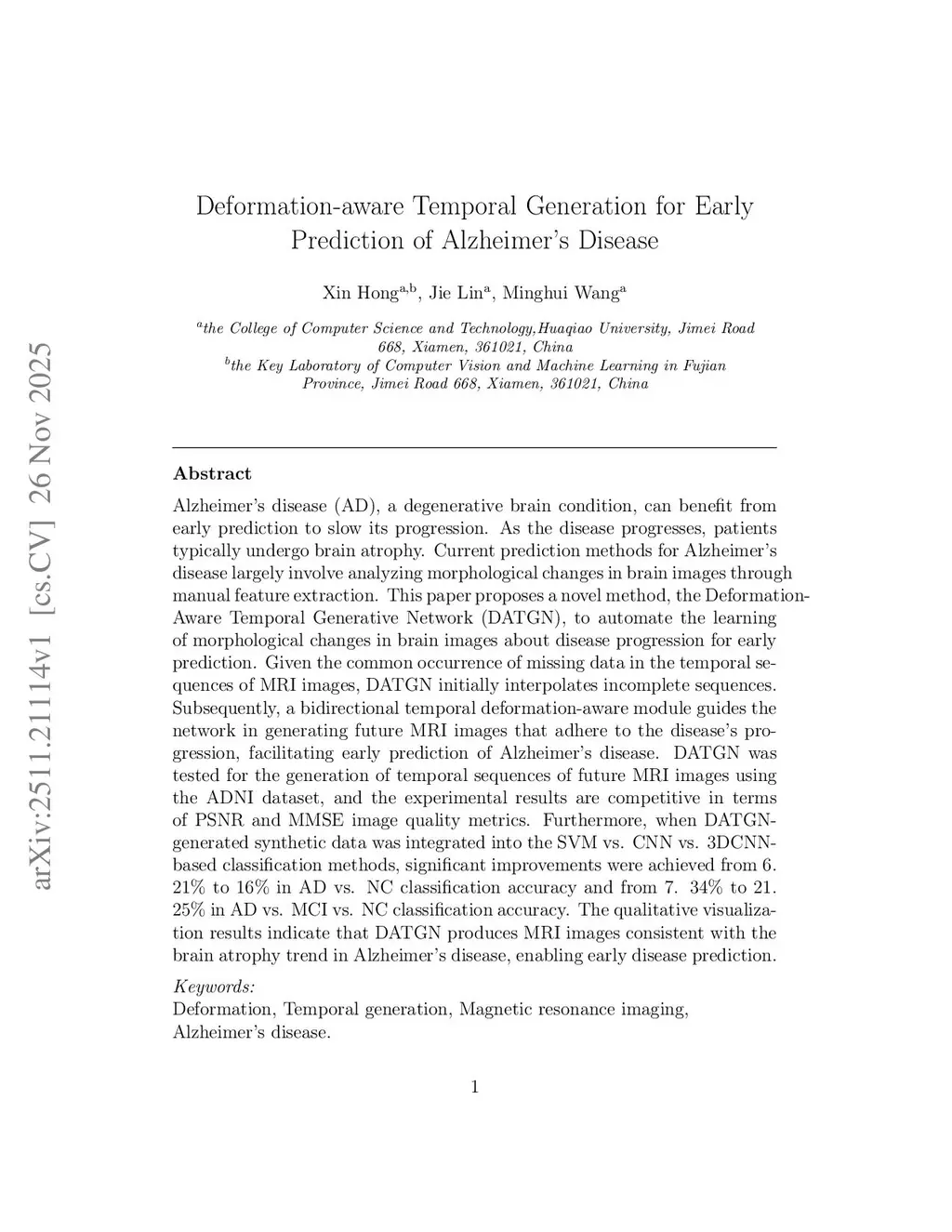 Alzheimer's disease (AD), a degenerative brain condition, can benefit from early prediction to slow its progression. As the disease progresses, patients typically undergo brain atrophy. Current prediction methods for Alzheimers disease largely involve analyzing morphological changes in brain images through manual feature extraction. This paper proposes a novel method, the Deformation-Aware Temporal Generative Network (DATGN), to automate the learning of morphological changes in brain images about disease progression for early prediction. Given the common occurrence of missing data in the temporal sequences of MRI images, DATGN initially interpolates incomplete sequences. Subsequently, a bidirectional temporal deformation-aware module guides the network in generating future MRI images that adhere to the disease's progression, facilitating early prediction of Alzheimer's disease. DATGN was tested for the generation of temporal sequences of future MRI images using the ADNI dataset, and the experimental results are competitive in terms of PSNR and MMSE image quality metrics. Furthermore, when DATGN-generated synthetic data was integrated into the SVM vs. CNN vs. 3DCNN-based classification methods, significant improvements were achieved from 6. 21\% to 16\% in AD vs. NC classification accuracy and from 7. 34\% to 21. 25\% in AD vs. MCI vs. NC classification accuracy. The qualitative visualization results indicate that DATGN produces MRI images consistent with the brain atrophy trend in Alzheimer's disease, enabling early disease prediction.