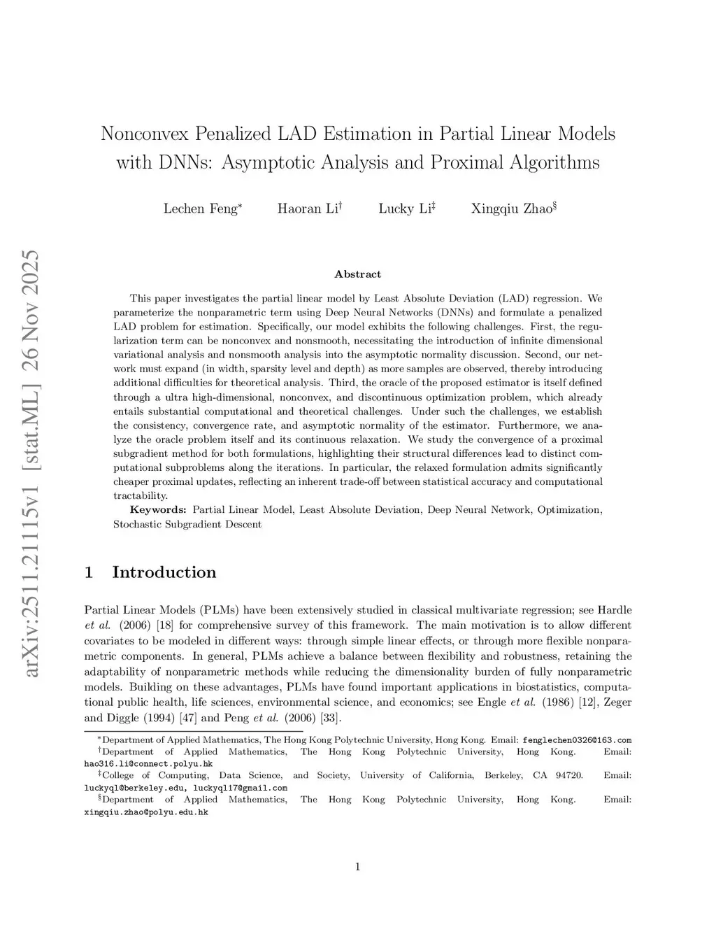 This paper investigates the partial linear model by Least Absolute Deviation (LAD) regression. We parameterize the nonparametric term using Deep Neural Networks (DNNs) and formulate a penalized LAD problem for estimation. Specifically, our model exhibits the following challenges. First, the regularization term can be nonconvex and nonsmooth, necessitating the introduction of infinite dimensional variational analysis and nonsmooth analysis into the asymptotic normality discussion. Second, our network must expand (in width, sparsity level and depth) as more samples are observed, thereby introducing additional difficulties for theoretical analysis. Third, the oracle of the proposed estimator is itself defined through a ultra high-dimensional, nonconvex, and discontinuous optimization problem, which already entails substantial computational and theoretical challenges. Under such the challenges, we establish the consistency, convergence rate, and asymptotic normality of the estimator. Furthermore, we analyze the oracle problem itself and its continuous relaxation. We study the convergence of a proximal subgradient method for both formulations, highlighting their structural differences lead to distinct computational subproblems along the iterations. In particular, the relaxed formulation admits significantly cheaper proximal updates, reflecting an inherent trade-off between statistical accuracy and computational tractability.
