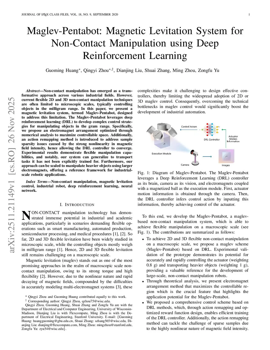 Maglev-Pentabot: Magnetic Levitation System for Non-Contact Manipulation using Deep Reinforcement Learning