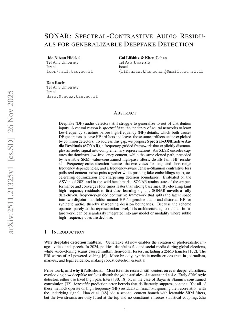 Deepfake (DF) audio detectors still struggle to generalize to out of distribution inputs. A central reason is spectral bias, the tendency of neural networks to learn low-frequency structure before high-frequency (HF) details, which both causes DF generators to leave HF artifacts and leaves those same artifacts under-exploited by common detectors. To address this gap, we propose Spectral-cONtrastive Audio Residuals (SONAR), a frequency-guided framework that explicitly disentangles an audio signal into complementary representations. An XLSR encoder captures the dominant low-frequency content, while the same cloned path, preceded by learnable SRM, value-constrained high-pass filters, distills faint HF residuals. Frequency cross-attention reunites the two views for long- and short-range frequency dependencies, and a frequency-aware Jensen-Shannon contrastive loss pulls real content-noise pairs together while pushing fake embeddings apart, accelerating optimization and sharpening decision boundaries. Evaluated on the ASVspoof 2021 and in-the-wild benchmarks, SONAR attains state-of-the-art performance and converges four times faster than strong baselines. By elevating faint high-frequency residuals to first-class learning signals, SONAR unveils a fully data-driven, frequency-guided contrastive framework that splits the latent space into two disjoint manifolds: natural-HF for genuine audio and distorted-HF for synthetic audio, thereby sharpening decision boundaries. Because the scheme operates purely at the representation level, it is architecture-agnostic and, in future work, can be seamlessly integrated into any model or modality where subtle high-frequency cues are decisive.