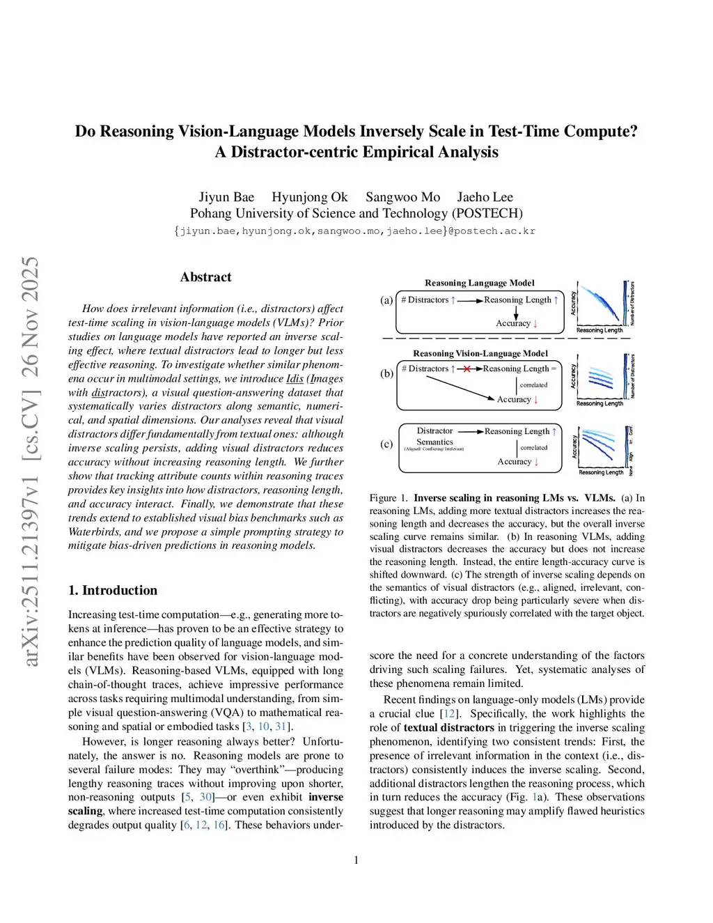 How does irrelevant information (i.e., distractors) affect test-time scaling in vision-language models (VLMs)? Prior studies on language models have reported an inverse scaling effect, where textual distractors lead to longer but less effective reasoning. To investigate whether similar phenomena occur in multimodal settings, we introduce Idis (Images with distractors), a visual question-answering dataset that systematically varies distractors along semantic, numerical, and spatial dimensions. Our analyses reveal that visual distractors differ fundamentally from textual ones: although inverse scaling persists, adding visual distractors reduces accuracy without increasing reasoning length. We further show that tracking attribute counts within reasoning traces provides key insights into how distractors, reasoning length, and accuracy interact. Finally, we demonstrate that these trends extend to established visual bias benchmarks such as Waterbirds, and we propose a simple prompting strategy to mitigate bias-driven predictions in reasoning models.