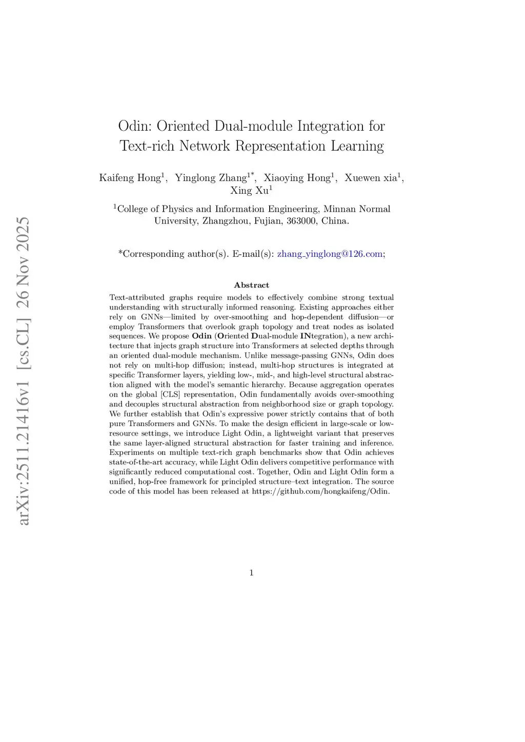 Text-attributed graphs require models to effectively combine strong textual understanding with structurally informed reasoning. Existing approaches either rely on GNNs--limited by over-smoothing and hop-dependent diffusion--or employ Transformers that overlook graph topology and treat nodes as isolated sequences. We propose Odin (Oriented Dual-module INtegration), a new architecture that injects graph structure into Transformers at selected depths through an oriented dual-module mechanism. Unlike message-passing GNNs, Odin does not rely on multi-hop diffusion; instead, multi-hop structures are integrated at specific Transformer layers, yielding low-, mid-, and high-level structural abstraction aligned with the model's semantic hierarchy. Because aggregation operates on the global [CLS] representation, Odin fundamentally avoids over-smoothing and decouples structural abstraction from neighborhood size or graph topology. We further establish that Odin's expressive power strictly contains that of both pure Transformers and GNNs. To make the design efficient in large-scale or low-resource settings, we introduce Light Odin, a lightweight variant that preserves the same layer-aligned structural abstraction for faster training and inference. Experiments on multiple text-rich graph benchmarks show that Odin achieves state-of-the-art accuracy, while Light Odin delivers competitive performance with significantly reduced computational cost. Together, Odin and Light Odin form a unified, hop-free framework for principled structure-text integration. The source code of this model has been released atthis https URL.