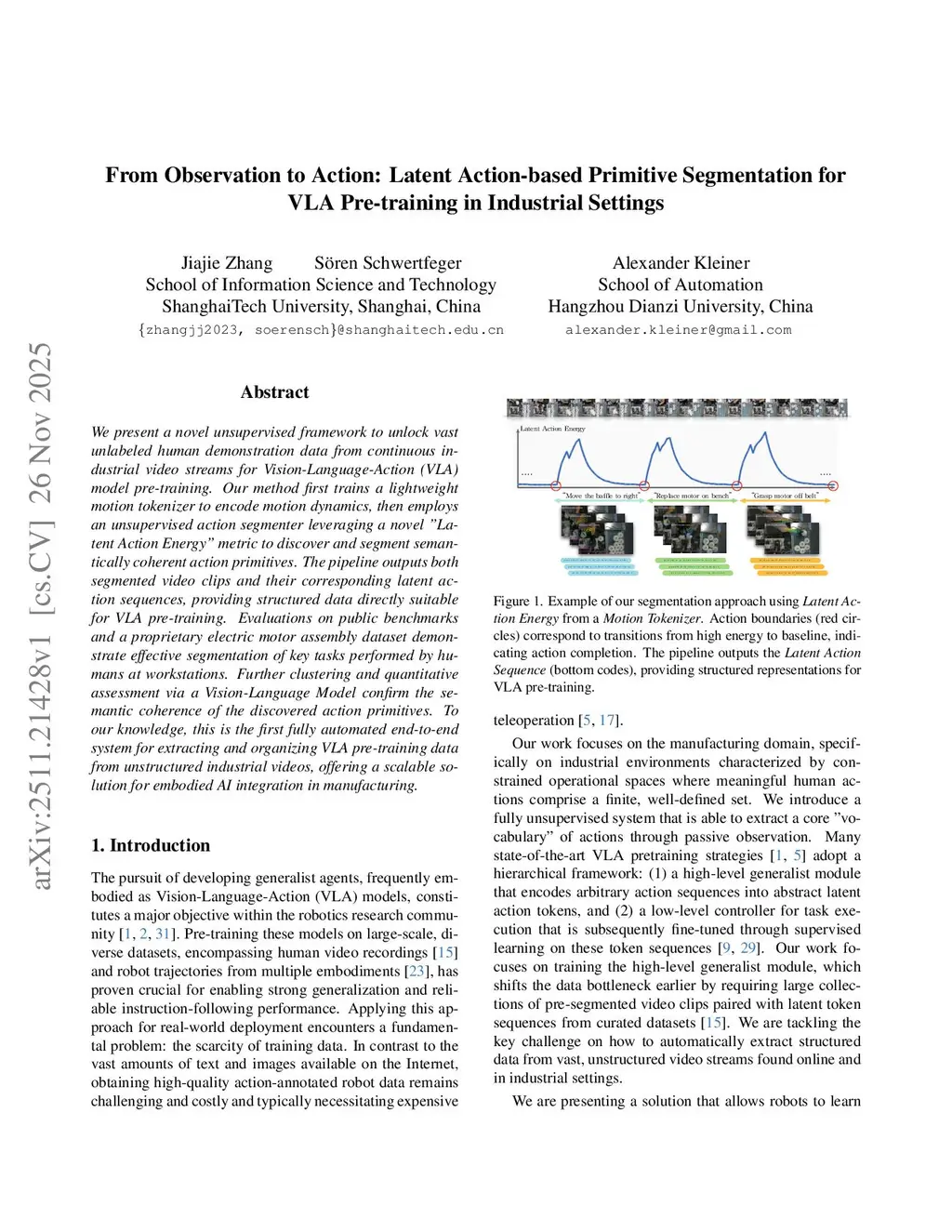 We present a novel unsupervised framework to unlock vast unlabeled human demonstration data from continuous industrial video streams for Vision-Language-Action (VLA) model pre-training. Our method first trains a lightweight motion tokenizer to encode motion dynamics, then employs an unsupervised action segmenter leveraging a novel "Latent Action Energy" metric to discover and segment semantically coherent action primitives. The pipeline outputs both segmented video clips and their corresponding latent action sequences, providing structured data directly suitable for VLA pre-training. Evaluations on public benchmarks and a proprietary electric motor assembly dataset demonstrate effective segmentation of key tasks performed by humans at workstations. Further clustering and quantitative assessment via a Vision-Language Model confirm the semantic coherence of the discovered action primitives. To our knowledge, this is the first fully automated end-to-end system for extracting and organizing VLA pre-training data from unstructured industrial videos, offering a scalable solution for embodied AI integration in manufacturing.