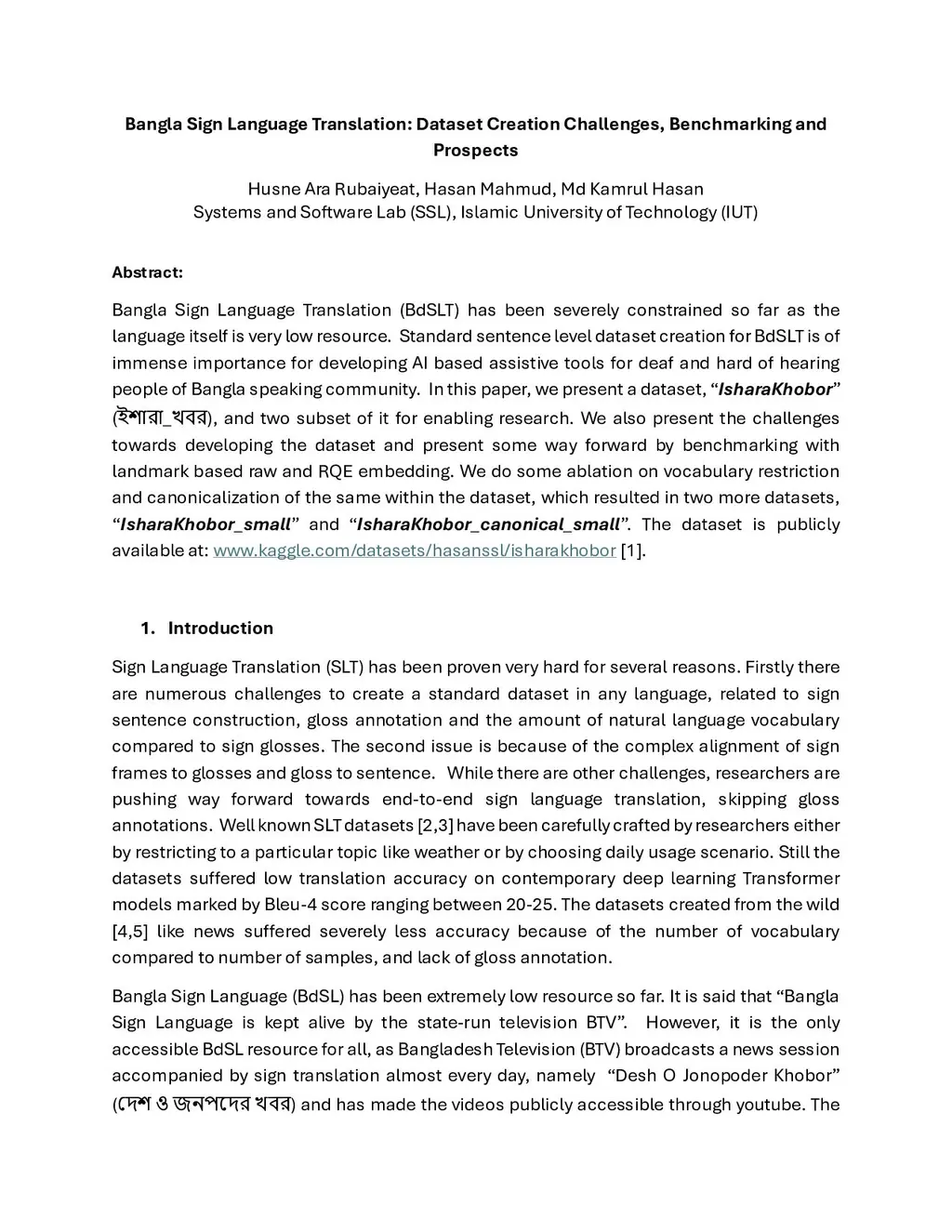 Bangla Sign Language Translation (BdSLT) has been severely constrained so far as the language itself is very low resource. Standard sentence level dataset creation for BdSLT is of immense importance for developing AI based assistive tools for deaf and hard of hearing people of Bangla speaking community. In this paper, we present a dataset, IsharaKhobor , and two subset of it for enabling research. We also present the challenges towards developing the dataset and present some way forward by benchmarking with landmark based raw and RQE embedding. We do some ablation on vocabulary restriction and canonicalization of the same within the dataset, which resulted in two more datasets, IsharaKhobor_small and IsharaKhobor_canonical_small. The dataset is publicly available at:this http URL[1].