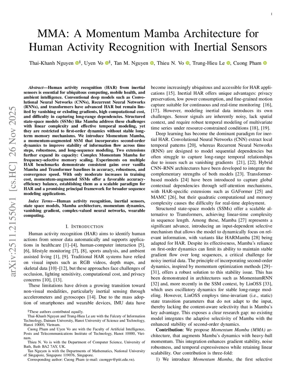 MMA: A Momentum Mamba Architecture for Human Activity Recognition with Inertial Sensors
