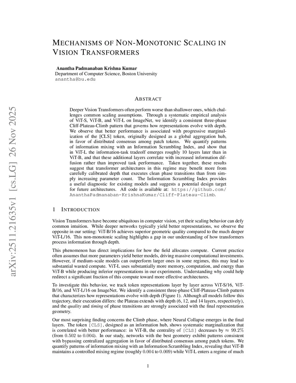 Deeper Vision Transformers often perform worse than shallower ones, which challenges common scaling assumptions. Through a systematic empirical analysis of ViT-S, ViT-B, and ViT-L on ImageNet, we identify a consistent three-phase Cliff-Plateau-Climb pattern that governs how representations evolve with depth. We observe that better performance is associated with progressive marginalization of the [CLS] token, originally designed as a global aggregation hub, in favor of distributed consensus among patch tokens. We quantify patterns of information mixing with an Information Scrambling Index, and show that in ViT-L the information-task tradeoff emerges roughly 10 layers later than in ViT-B, and that these additional layers correlate with increased information diffusion rather than improved task performance. Taken together, these results suggest that transformer architectures in this regime may benefit more from carefully calibrated depth that executes clean phase transitions than from simply increasing parameter count. The Information Scrambling Index provides a useful diagnostic for existing models and suggests a potential design target for future architectures. All code is available at:this https URL.