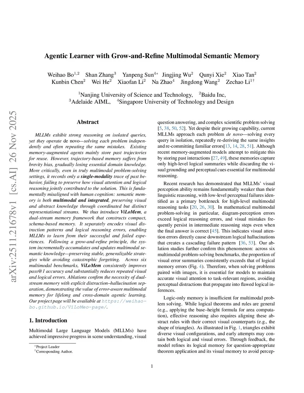 MLLMs exhibit strong reasoning on isolated queries, yet they operate de novo -- solving each problem independently and often repeating the same mistakes. Existing memory-augmented agents mainly store past trajectories for reuse. However, trajectory-based memory suffers from brevity bias, gradually losing essential domain knowledge. More critically, even in truly multimodal problem-solving settings, it records only a single-modality trace of past behavior, failing to preserve how visual attention and logical reasoning jointly contributed to the solution. This is fundamentally misaligned with human cognition: semantic memory is both multimodal and integrated, preserving visual and abstract knowledge through coordinated but distinct representational streams. We thus introduce ViLoMem, a dual-stream memory framework that constructs compact, schema-based memory. It separately encodes visual distraction patterns and logical reasoning errors, enabling MLLMs to learn from their successful and failed experiences. Following a grow-and-refine principle, the system incrementally accumulates and updates multimodal semantic knowledge -- preserving stable, generalizable strategies while avoiding catastrophic forgetting. Across six multimodal benchmarks, ViLoMem consistently improves pass@1 accuracy and substantially reduces repeated visual and logical errors. Ablations confirm the necessity of dual-stream memory with explicit distraction--hallucination separation, demonstrating the value of error-aware multimodal memory for lifelong and cross-domain agentic learning. Our project page will be available atthis https URL.