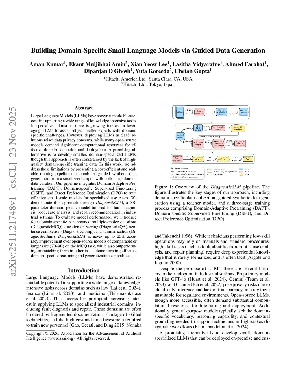 Large Language Models (LLMs) have shown remarkable success in supporting a wide range of knowledge-intensive tasks. In specialized domains, there is growing interest in leveraging LLMs to assist subject matter experts with domain-specific challenges. However, deploying LLMs as SaaS solutions raises data privacy concerns, while many open-source models demand significant computational resources for effective domain adaptation and deployment. A promising alternative is to develop smaller, domain-specialized LLMs, though this approach is often constrained by the lack of high-quality domain-specific training data. In this work, we address these limitations by presenting a cost-efficient and scalable training pipeline that combines guided synthetic data generation from a small seed corpus with bottom-up domain data curation. Our pipeline integrates Domain-Adaptive Pretraining (DAPT), Domain-specific Supervised Fine-tuning (DSFT), and Direct Preference Optimization (DPO) to train effective small-scale models for specialized use cases. We demonstrate this approach through DiagnosticSLM, a 3B-parameter domain-specific model tailored for fault diagnosis, root cause analysis, and repair recommendation in industrial settings. To evaluate model performance, we introduce four domain-specific benchmarks: multiple-choice questions (DiagnosticMCQ), question answering (DiagnosticQA), sentence completion (DiagnosticComp), and summarization (DiagnosticSum). DiagnosticSLM achieves up to 25% accuracy improvement over open-source models of comparable or larger size (2B-9B) on the MCQ task, while also outperforming or matching them in other tasks, demonstrating effective domain-specific reasoning and generalization capabilities.