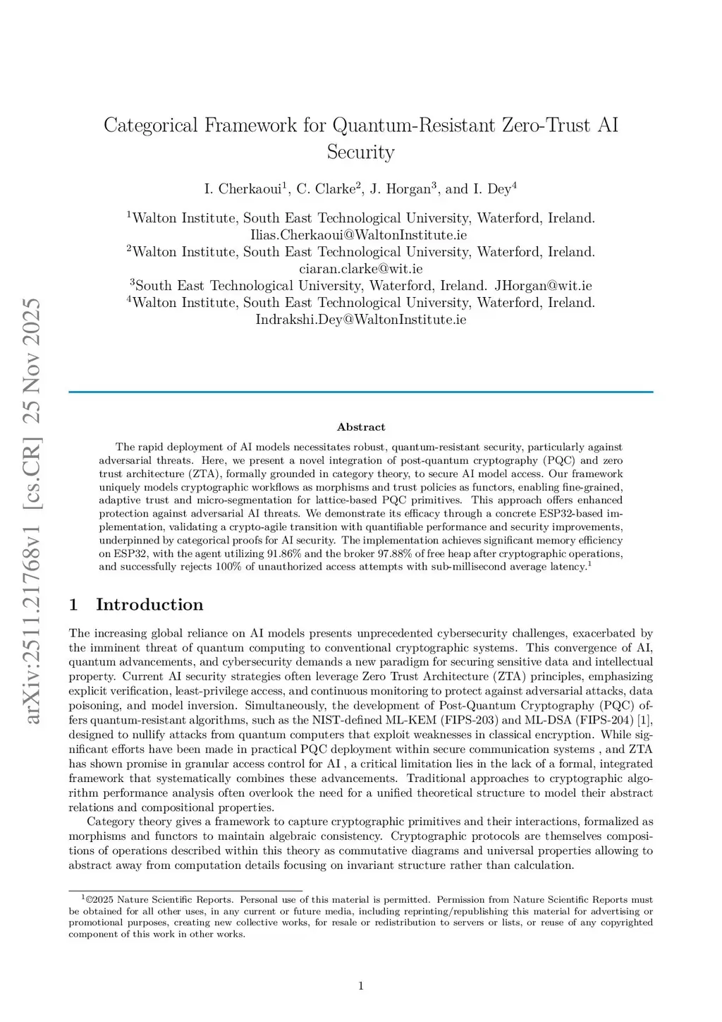 The rapid deployment of AI models necessitates robust, quantum-resistant security, particularly against adversarial threats. Here, we present a novel integration of post-quantum cryptography (PQC) and zero trust architecture (ZTA), formally grounded in category theory, to secure AI model access. Our framework uniquely models cryptographic workflows as morphisms and trust policies as functors, enabling fine-grained, adaptive trust and micro-segmentation for lattice-based PQC primitives. This approach offers enhanced protection against adversarial AI threats. We demonstrate its efficacy through a concrete ESP32-based implementation, validating a crypto-agile transition with quantifiable performance and security improvements, underpinned by categorical proofs for AI security. The implementation achieves significant memory efficiency on ESP32, with the agent utilizing 91.86% and the broker 97.88% of free heap after cryptographic operations, and successfully rejects 100% of unauthorized access attempts with sub-millisecond average latency.
