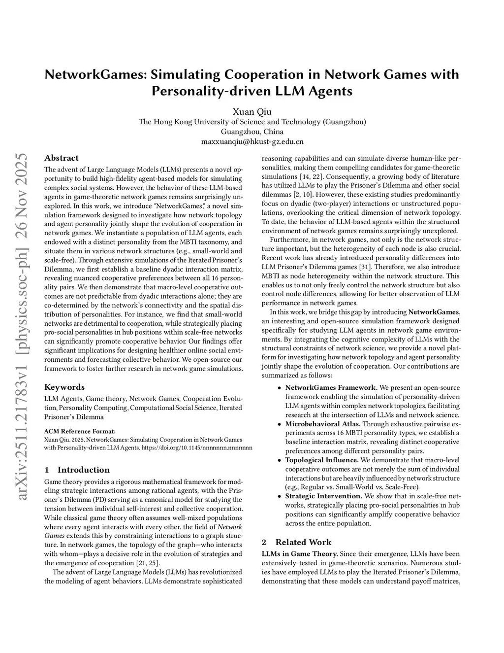 NetworkGames: Simulating Cooperation in Network Games with Personality-driven LLM Agents