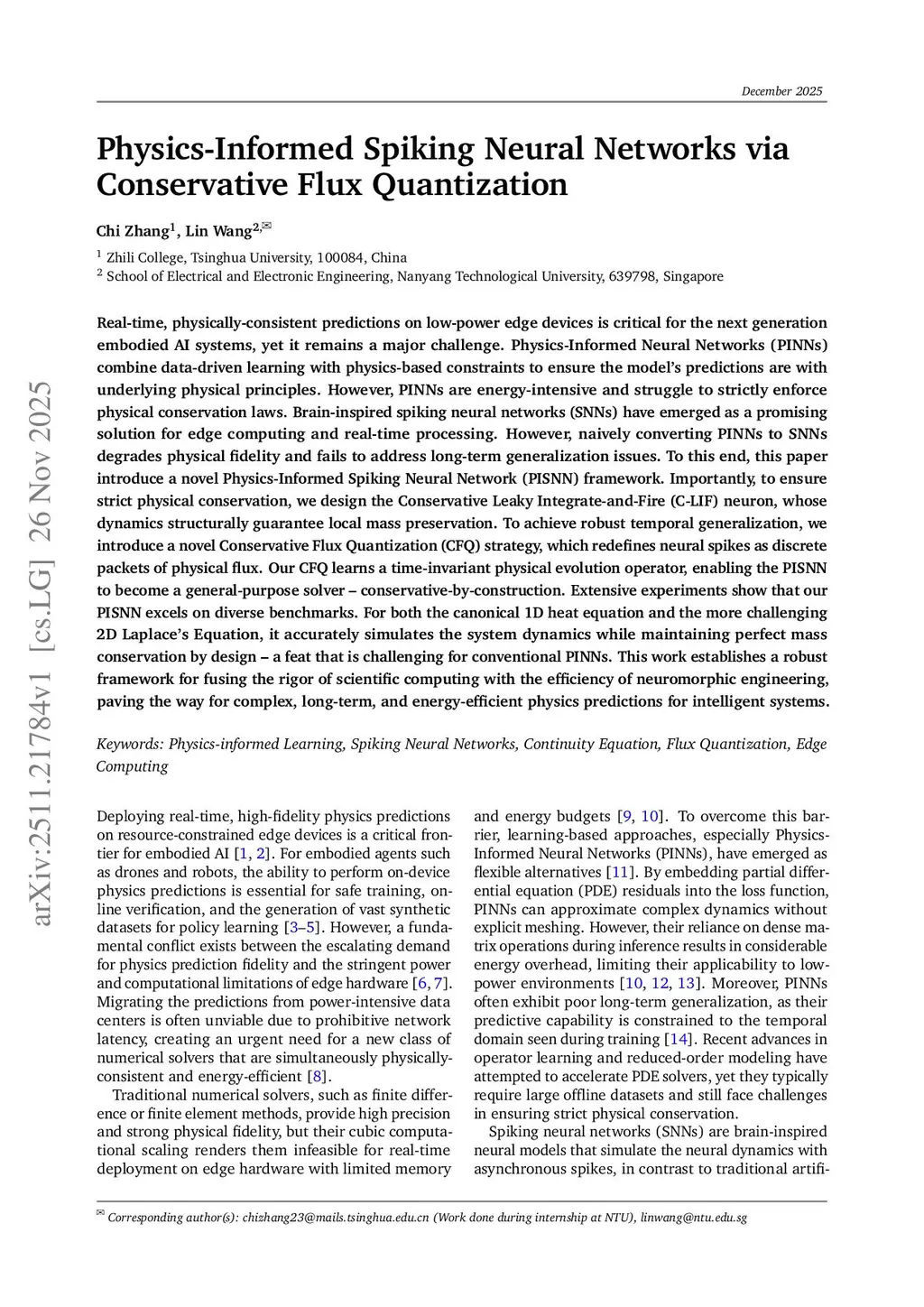 Real-time, physically-consistent predictions on low-power edge devices is critical for the next generation embodied AI systems, yet it remains a major challenge. Physics-Informed Neural Networks (PINNs) combine data-driven learning with physics-based constraints to ensure the model's predictions are with underlying physicalthis http URL, PINNs are energy-intensive and struggle to strictly enforce physical conservation laws. Brain-inspired spiking neural networks (SNNs) have emerged as a promising solution for edge computing and real-time processing. However, naively converting PINNs to SNNs degrades physical fidelity and fails to address long-term generalization issues. To this end, this paper introduce a novel Physics-Informed Spiking Neural Network (PISNN) framework. Importantly, to ensure strict physical conservation, we design the Conservative Leaky Integrate-and-Fire (C-LIF) neuron, whose dynamics structurally guarantee local mass preservation. To achieve robust temporal generalization, we introduce a novel Conservative Flux Quantization (CFQ) strategy, which redefines neural spikes as discrete packets of physical flux. Our CFQ learns a time-invariant physical evolution operator, enabling the PISNN to become a general-purpose solver -- conservative-by-construction. Extensive experiments show that our PISNN excels on diverse benchmarks. For both the canonical 1D heat equation and the more challenging 2D Laplace's Equation, it accurately simulates the system dynamics while maintaining perfect mass conservation by design -- a feat that is challenging for conventional PINNs. This work establishes a robust framework for fusing the rigor of scientific computing with the efficiency of neuromorphic engineering, paving the way for complex, long-term, and energy-efficient physics predictions for intelligent systems.