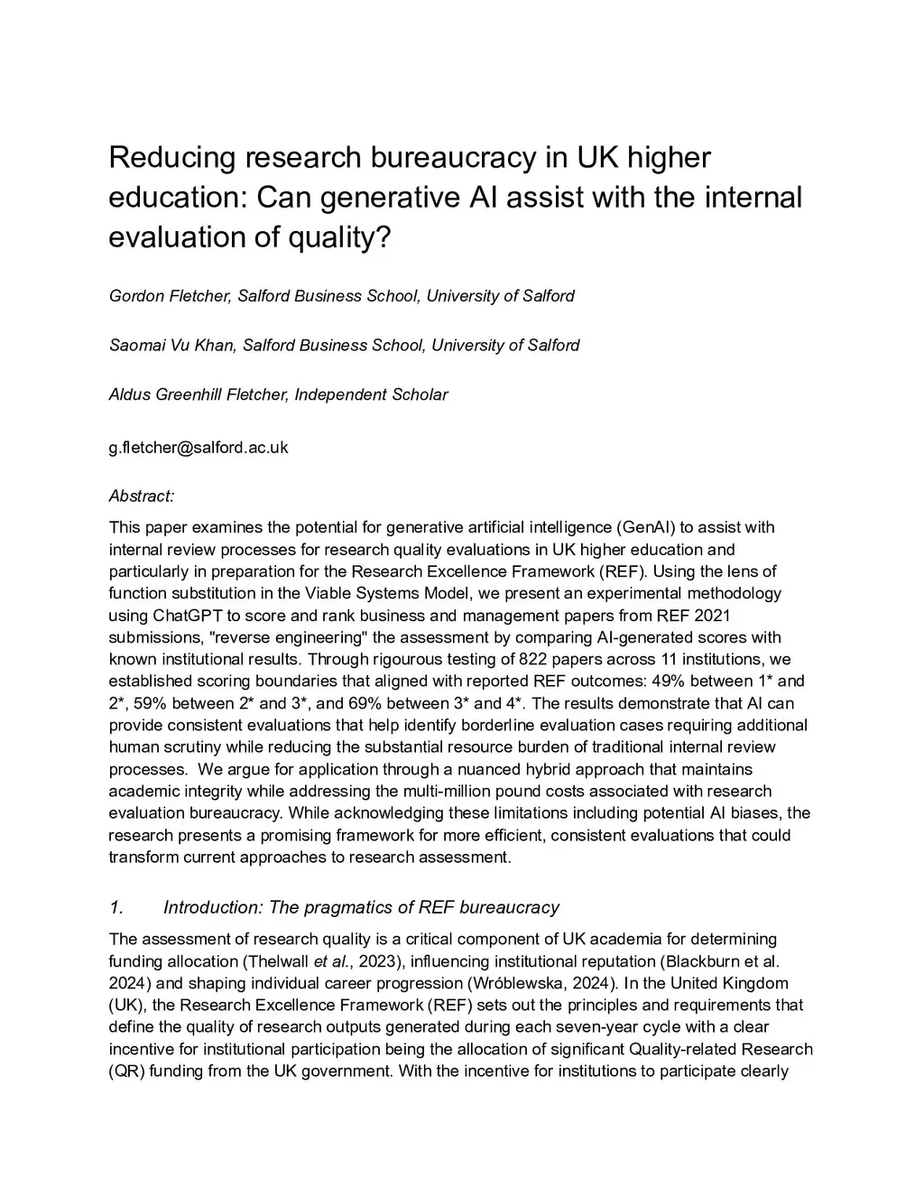 This paper examines the potential for generative artificial intelligence (GenAI) to assist with internal review processes for research quality evaluations in UK higher education and particularly in preparation for the Research Excellence Framework (REF). Using the lens of function substitution in the Viable Systems Model, we present an experimental methodology using ChatGPT to score and rank business and management papers from REF 2021 submissions, "reverse engineering" the assessment by comparing AI-generated scores with known institutional results. Through rigourous testing of 822 papers across 11 institutions, we established scoring boundaries that aligned with reported REF outcomes: 49% between 1* and 2*, 59% between 2* and 3*, and 69% between 3* and 4*. The results demonstrate that AI can provide consistent evaluations that help identify borderline evaluation cases requiring additional human scrutiny while reducing the substantial resource burden of traditional internal review processes. We argue for application through a nuanced hybrid approach that maintains academic integrity while addressing the multi-million pound costs associated with research evaluation bureaucracy. While acknowledging these limitations including potential AI biases, the research presents a promising framework for more efficient, consistent evaluations that could transform current approaches to research assessment.