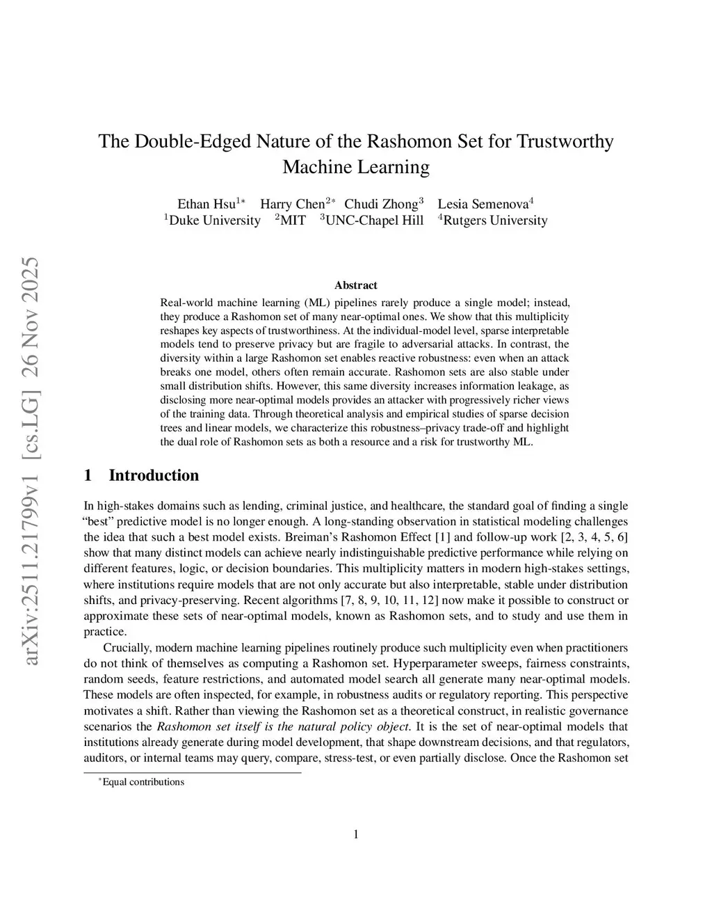 Real-world machine learning (ML) pipelines rarely produce a single model; instead, they produce a Rashomon set of many near-optimal ones. We show that this multiplicity reshapes key aspects of trustworthiness. At the individual-model level, sparse interpretable models tend to preserve privacy but are fragile to adversarial attacks. In contrast, the diversity within a large Rashomon set enables reactive robustness: even when an attack breaks one model, others often remain accurate. Rashomon sets are also stable under small distribution shifts. However, this same diversity increases information leakage, as disclosing more near-optimal models provides an attacker with progressively richer views of the training data. Through theoretical analysis and empirical studies of sparse decision trees and linear models, we characterize this robustness-privacy trade-off and highlight the dual role of Rashomon sets as both a resource and a risk for trustworthy ML.