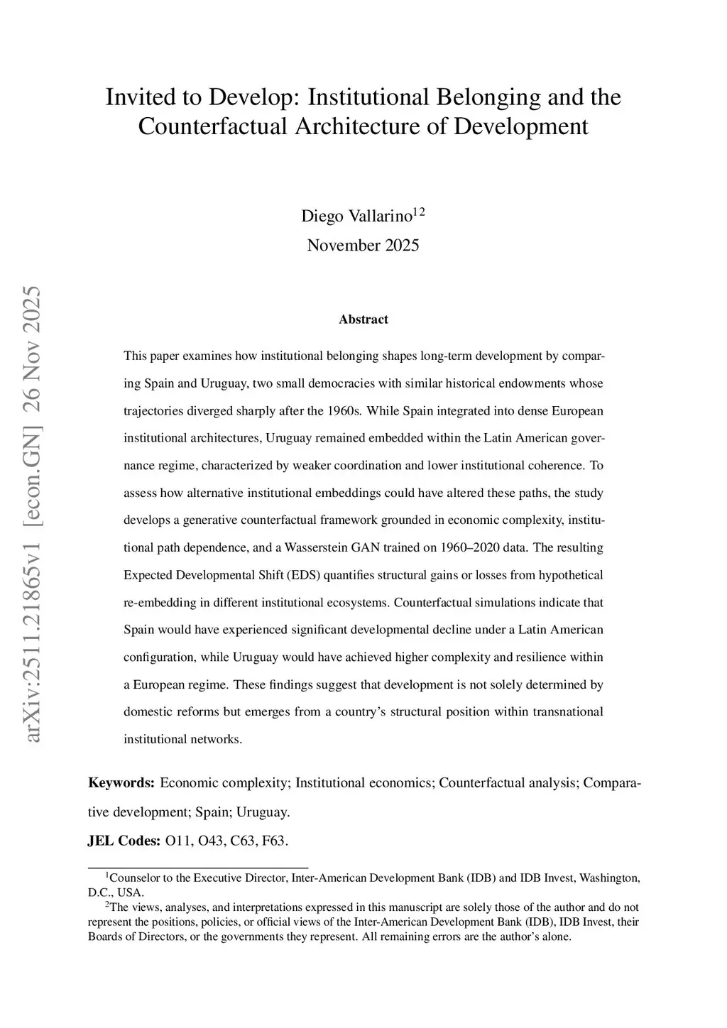 This paper examines how institutional belonging shapes long-term development by comparing Spain and Uruguay, two small democracies with similar historical endowments whose trajectories diverged sharply after the 1960s. While Spain integrated into dense European institutional architectures, Uruguay remained embedded within the Latin American governance regime, characterized by weaker coordination and lower institutional coherence. To assess how alternative institutional embeddings could have altered these paths, the study develops a generative counterfactual framework grounded in economic complexity, institutional path dependence, and a Wasserstein GAN trained on data from 1960-2020. The resulting Expected Developmental Shift (EDS) quantifies structural gains or losses from hypothetical re-embedding in different institutional ecosystems. Counterfactual simulations indicate that Spain would have experienced significant developmental decline under a Latin American configuration, while Uruguay would have achieved higher complexity and resilience within a European regime. These findings suggest that development is not solely determined by domestic reforms but emerges from a country's structural position within transnational institutional networks.