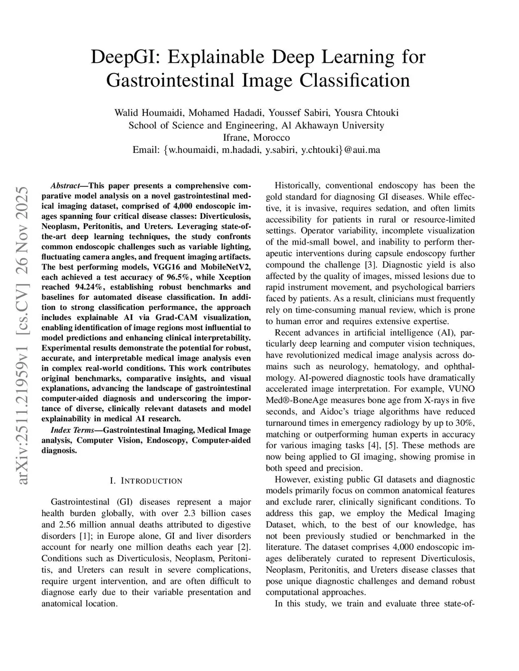 This paper presents a comprehensive comparative model analysis on a novel gastrointestinal medical imaging dataset, comprised of 4,000 endoscopic images spanning four critical disease classes: Diverticulosis, Neoplasm, Peritonitis, and Ureters. Leveraging state-of-the-art deep learning techniques, the study confronts common endoscopic challenges such as variable lighting, fluctuating camera angles, and frequent imaging artifacts. The best performing models, VGG16 and MobileNetV2, each achieved a test accuracy of 96.5%, while Xception reached 94.24%, establishing robust benchmarks and baselines for automated disease classification. In addition to strong classification performance, the approach includes explainable AI via Grad-CAM visualization, enabling identification of image regions most influential to model predictions and enhancing clinical interpretability. Experimental results demonstrate the potential for robust, accurate, and interpretable medical image analysis even in complex real-world conditions. This work contributes original benchmarks, comparative insights, and visual explanations, advancing the landscape of gastrointestinal computer-aided diagnosis and underscoring the importance of diverse, clinically relevant datasets and model explainability in medical AI research.