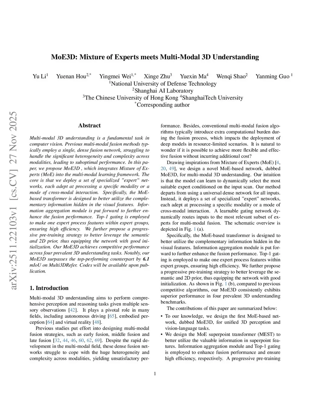 Multi-modal 3D understanding is a fundamental task in computer vision. Previous multi-modal fusion methods typically employ a single, dense fusion network, struggling to handle the significant heterogeneity and complexity across modalities, leading to suboptimal performance. In this paper, we propose MoE3D, which integrates Mixture of Experts (MoE) into the multi-modal learning framework. The core is that we deploy a set of specialized "expert" networks, each adept at processing a specific modality or a mode of cross-modal interaction. Specifically, the MoE-based transformer is designed to better utilize the complementary information hidden in the visual features. Information aggregation module is put forward to further enhance the fusion performance. Top-1 gating is employed to make one expert process features with expert groups, ensuring high efficiency. We further propose a progressive pre-training strategy to better leverage the semantic and 2D prior, thus equipping the network with good initialization. Our MoE3D achieves competitive performance across four prevalent 3D understanding tasks. Notably, our MoE3D surpasses the top-performing counterpart by 6.1 mIoU on Multi3DRefer.