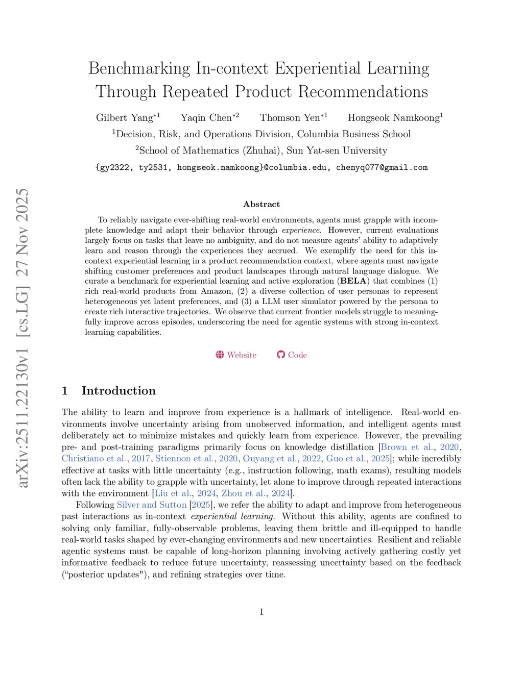 To reliably navigate ever-shifting real-world environments, agents must grapple with incomplete knowledge and adapt their behavior through experience. However, current evaluations largely focus on tasks that leave no ambiguity, and do not measure agents' ability to adaptively learn and reason through the experiences they accrued. We exemplify the need for this in-context experiential learning in a product recommendation context, where agents must navigate shifting customer preferences and product landscapes through natural language dialogue. We curate a benchmark for experiential learning and active exploration (BELA) that combines (1) rich real-world products from Amazon, (2) a diverse collection of user personas to represent heterogeneous yet latent preferences, and (3) a LLM user simulator powered by the persona to create rich interactive trajectories. We observe that current frontier models struggle to meaningfully improve across episodes, underscoring the need for agentic systems with strong in-context learning capabilities.