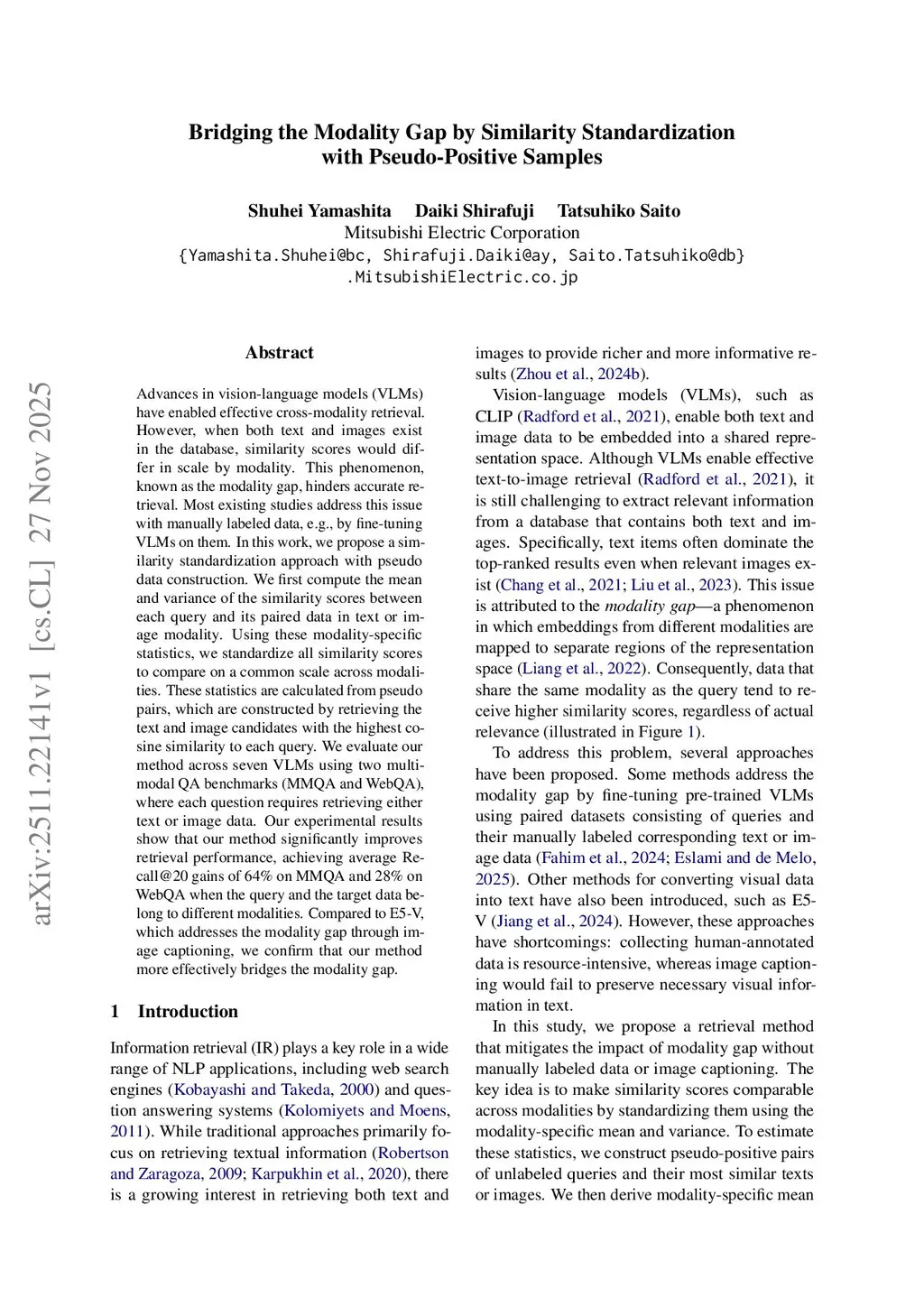 Bridging the Modality Gap by Similarity Standardization with Pseudo-Positive Samples