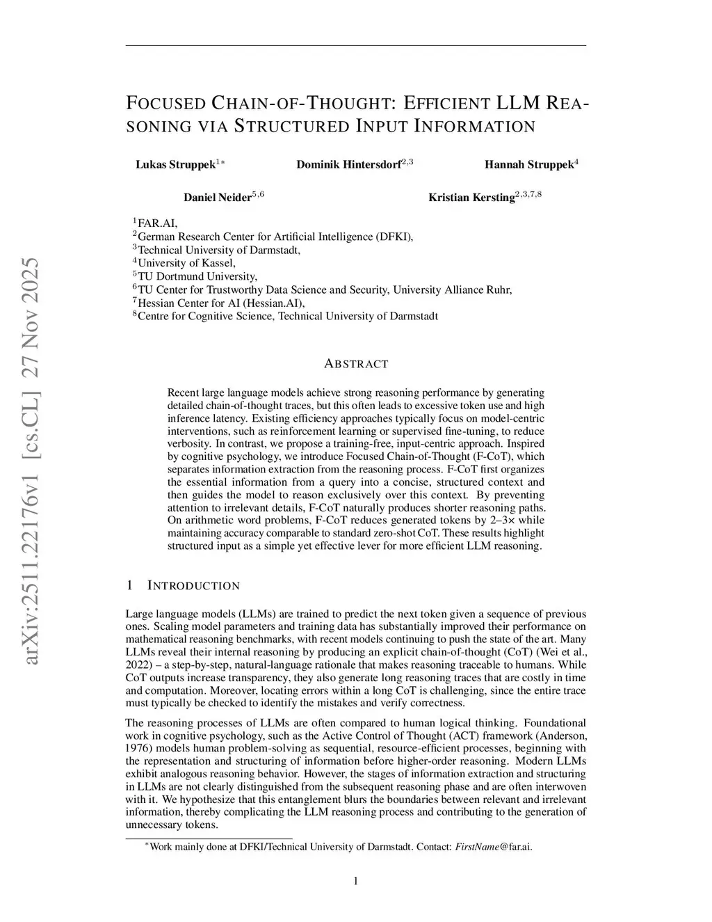 Recent large language models achieve strong reasoning performance by generating detailed chain-of-thought traces, but this often leads to excessive token use and high inference latency. Existing efficiency approaches typically focus on model-centric interventions, such as reinforcement learning or supervised fine-tuning, to reduce verbosity. In contrast, we propose a training-free, input-centric approach. Inspired by cognitive psychology, we introduce Focused Chain-of-Thought (F-CoT), which separates information extraction from the reasoning process. F-CoT first organizes the essential information from a query into a concise, structured context and then guides the model to reason exclusively over this context. By preventing attention to irrelevant details, F-CoT naturally produces shorter reasoning paths. On arithmetic word problems, F-CoT reduces generated tokens by 2-3x while maintaining accuracy comparable to standard zero-shot CoT. These results highlight structured input as a simple yet effective lever for more efficient LLM reasoning.
