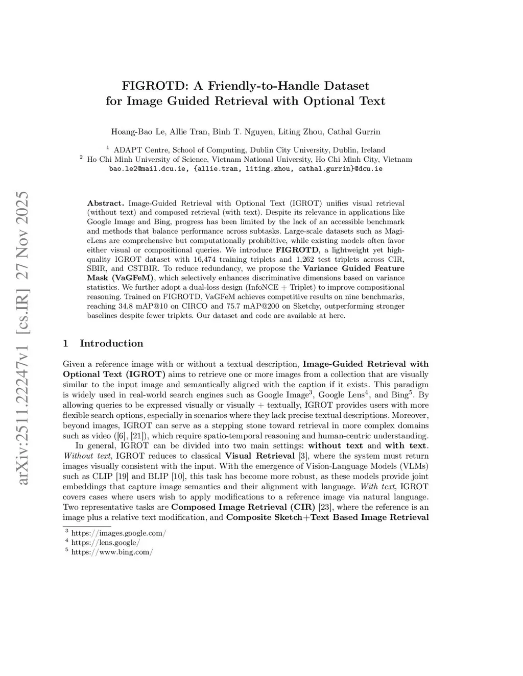 Image-Guided Retrieval with Optional Text (IGROT) unifies visual retrieval (without text) and composed retrieval (with text). Despite its relevance in applications like Google Image and Bing, progress has been limited by the lack of an accessible benchmark and methods that balance performance across subtasks. Large-scale datasets such as MagicLens are comprehensive but computationally prohibitive, while existing models often favor either visual or compositional queries. We introduce FIGROTD, a lightweight yet high-quality IGROT dataset with 16,474 training triplets and 1,262 test triplets across CIR, SBIR, and CSTBIR. To reduce redundancy, we propose the Variance Guided Feature Mask (VaGFeM), which selectively enhances discriminative dimensions based on variance statistics. We further adopt a dual-loss design (InfoNCE + Triplet) to improve compositional reasoning. Trained on FIGROTD, VaGFeM achieves competitive results on nine benchmarks, reaching 34.8 mAP@10 on CIRCO and 75.7 mAP@200 on Sketchy, outperforming stronger baselines despite fewer triplets.