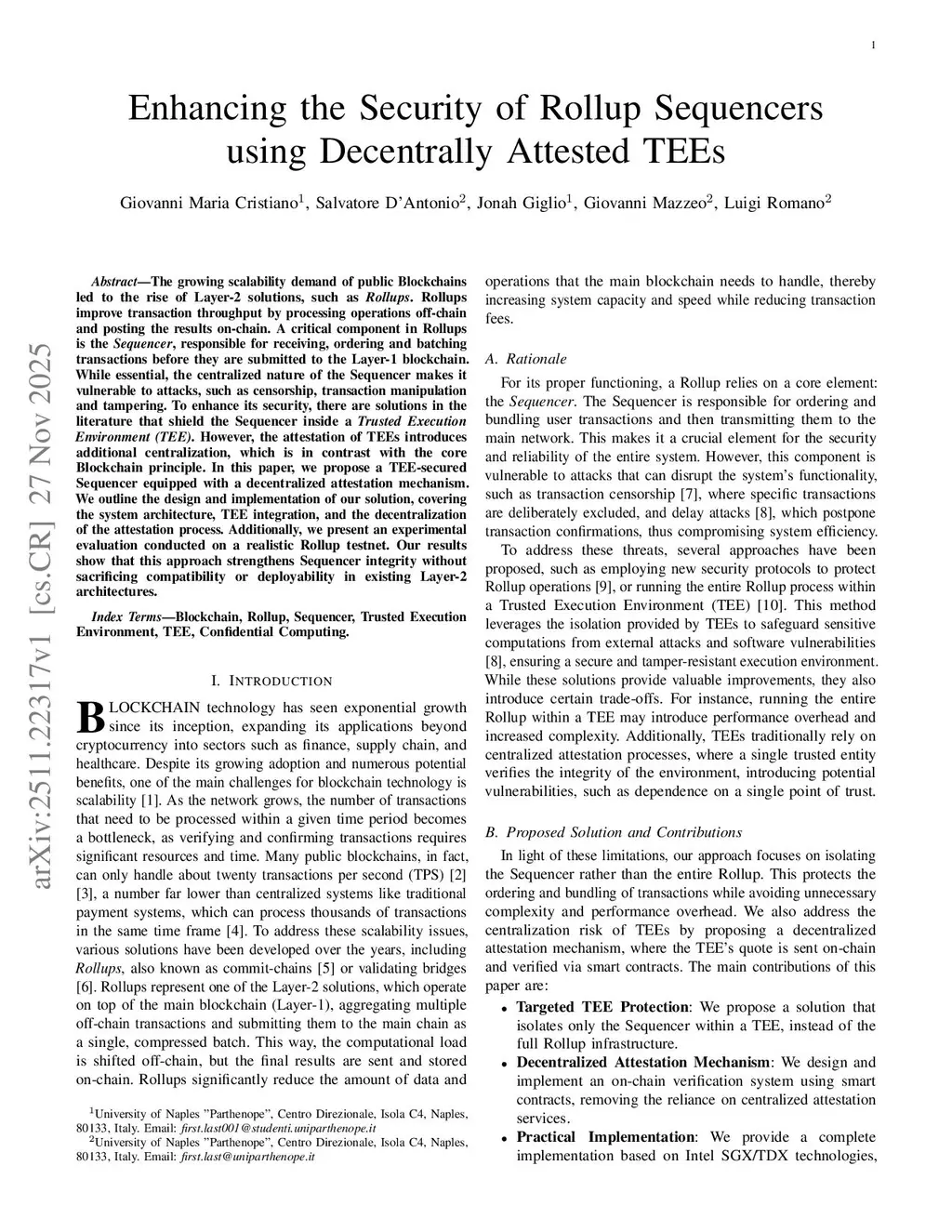 The growing scalability demand of public Blockchains led to the rise of Layer-2 solutions, such as Rollups. Rollups improve transaction throughput by processing operations off-chain and posting the results on-chain. A critical component in Rollups is the Sequencer, responsible for receiving, ordering and batching transactions before they are submitted to the Layer-1 blockchain. While essential, the centralized nature of the Sequencer makes it vulnerable to attacks, such as censorship, transaction manipulation and tampering. To enhance its security, there are solutions in the literature that shield the Sequencer inside a Trusted Execution Environment (TEE). However, the attestation of TEEs introduces additional centralization, which is in contrast with the core Blockchain principle. In this paper, we propose a TEE-secured Sequencer equipped with a decentralized attestation mechanism. We outline the design and implementation of our solution, covering the system architecture, TEE integration, and the decentralization of the attestation process. Additionally, we present an experimental evaluation conducted on a realistic Rollup testnet. Our results show that this approach strengthens Sequencer integrity without sacrificing compatibility or deployability in existing Layer-2 architectures.