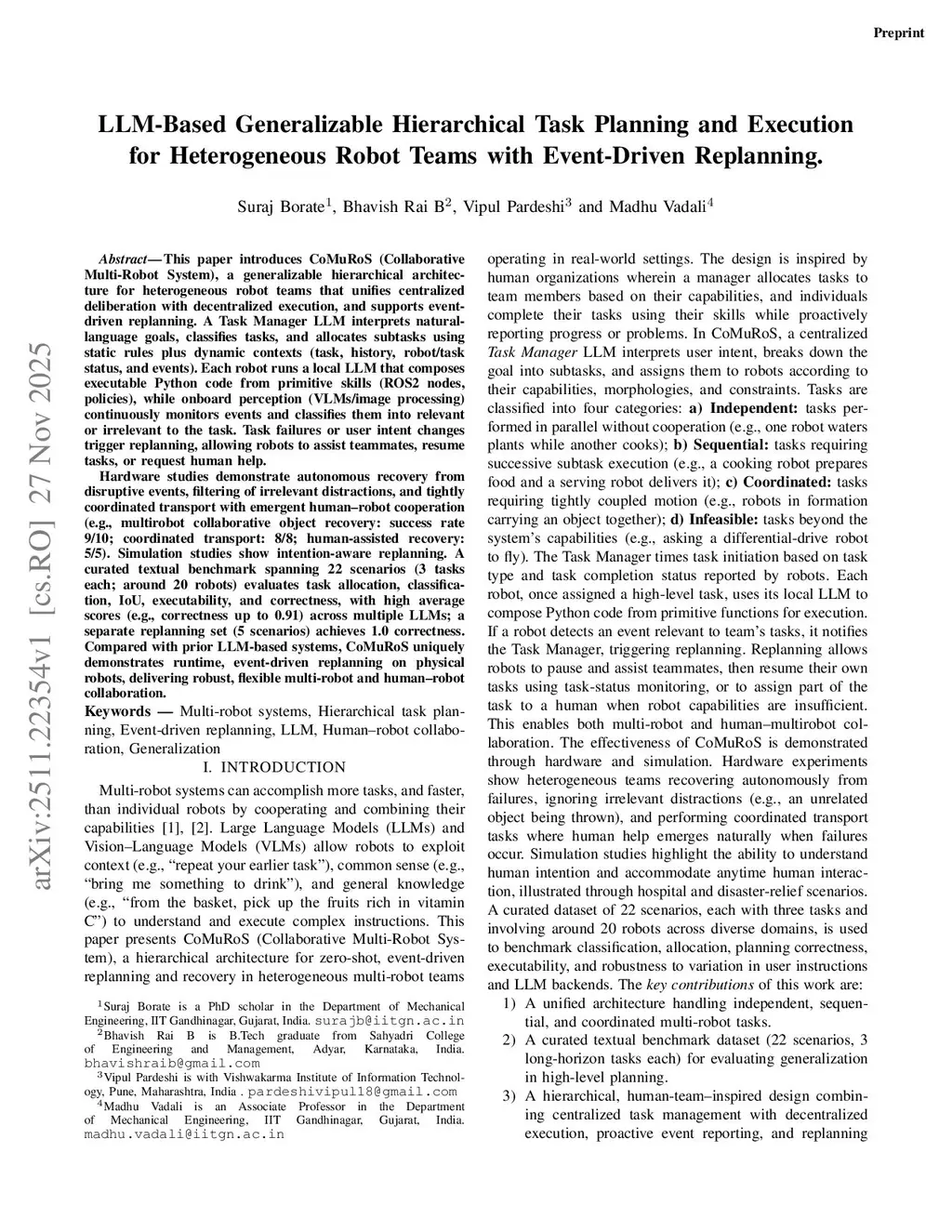 This paper introduces CoMuRoS (Collaborative Multi-Robot System), a generalizable hierarchical architecture for heterogeneous robot teams that unifies centralized deliberation with decentralized execution, and supports event-driven replanning. A Task Manager LLM interprets natural-language goals, classifies tasks, and allocates subtasks using static rules plus dynamic contexts (task, history, robot and task status, and events).Each robot runs a local LLM that composes executable Python code from primitive skills (ROS2 nodes, policies), while onboard perception (VLMs/image processing) continuously monitors events and classifies them into relevant or irrelevant to the task. Task failures or user intent changes trigger replanning, allowing robots to assist teammates, resume tasks, or request human help. Hardware studies demonstrate autonomous recovery from disruptive events, filtering of irrelevant distractions, and tightly coordinated transport with emergent human-robot cooperation (e.g., multirobot collaborative object recovery success rate: 9/10, coordinated transport: 8/8, human-assisted recovery: 5/5).Simulation studies show intention-aware replanning. A curated textual benchmark spanning 22 scenarios (3 tasks each, around 20 robots) evaluates task allocation, classification, IoU, executability, and correctness, with high average scores (e.g., correctness up to 0.91) across multiple LLMs, a separate replanning set (5 scenarios) achieves 1.0 correctness. Compared with prior LLM-based systems, CoMuRoS uniquely demonstrates runtime, event-driven replanning on physical robots, delivering robust, flexible multi-robot and human-robot collaboration.