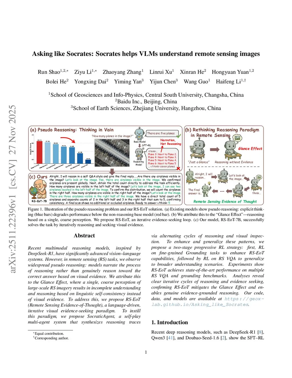 Recent multimodal reasoning models, inspired by DeepSeek-R1, have significantly advanced vision-language systems. However, in remote sensing (RS) tasks, we observe widespread pseudo reasoning: models narrate the process of reasoning rather than genuinely reason toward the correct answer based on visual evidence. We attribute this to the Glance Effect, where a single, coarse perception of large-scale RS imagery results in incomplete understanding and reasoning based on linguistic self-consistency instead of visual evidence. To address this, we propose RS-EoT (Remote Sensing Evidence-of-Thought), a language-driven, iterative visual evidence-seeking paradigm. To instill this paradigm, we propose SocraticAgent, a self-play multi-agent system that synthesizes reasoning traces via alternating cycles of reasoning and visual inspection. To enhance and generalize these patterns, we propose a two-stage progressive RL strategy: first, RL on fine-grained Grounding tasks to enhance RS-EoT capabilities, followed by RL on RS VQA to generalize to broader understanding scenarios. Experiments show RS-EoT achieves state-of-the-art performance on multiple RS VQA and grounding benchmarks. Analyses reveal clear iterative cycles of reasoning and evidence seeking, confirming RS-EoT mitigates the Glance Effect and enables genuine evidence-grounded reasoning. Our code, data, and models are available atthis https URL