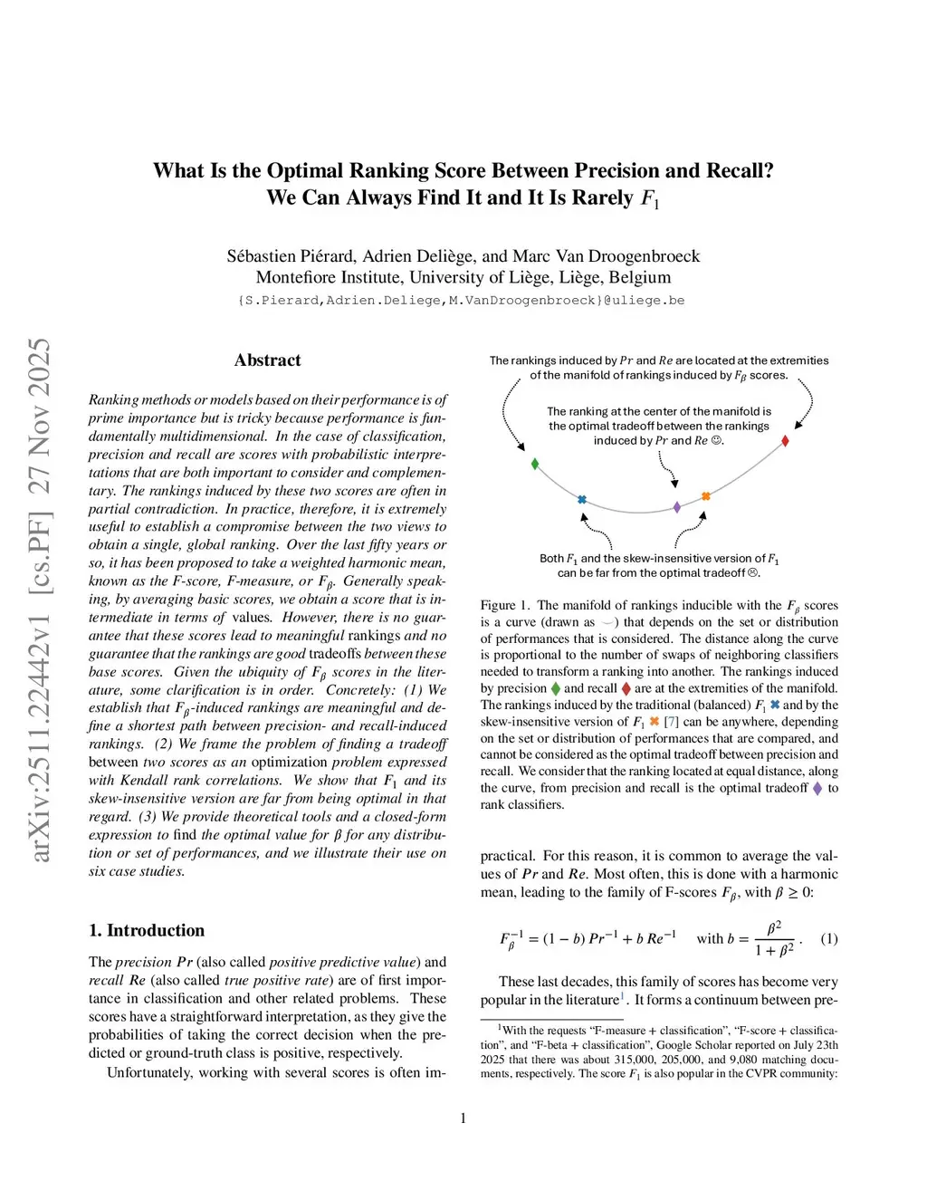 Ranking methods or models based on their performance is of prime importance but is tricky because performance is fundamentally multidimensional. In the case of classification, precision and recall are scores with probabilistic interpretations that are both important to consider and complementary. The rankings induced by these two scores are often in partial contradiction. In practice, therefore, it is extremely useful to establish a compromise between the two views to obtain a single, global ranking. Over the last fifty years or so, it has been proposed to take a weighted harmonic mean, known as the F-score, F-measure, or . Generally speaking, by averaging basic scores, we obtain a score that is intermediate in terms of values. However, there is no guarantee that these scores lead to meaningful rankings and no guarantee that the rankings are good tradeoffs between these base scores. Given the ubiquity of scores in the literature, some clarification is in order. Concretely: (1) We establish that -induced rankings are meaningful and define a shortest path between precision- and recall-induced rankings. (2) We frame the problem of finding a tradeoff between two scores as an optimization problem expressed with Kendall rank correlations. We show that and its skew-insensitive version are far from being optimal in that regard. (3) We provide theoretical tools and a closed-form expression to find the optimal value for for any distribution or set of performances, and we illustrate their use on six case studies. Code is available atthis https URL.