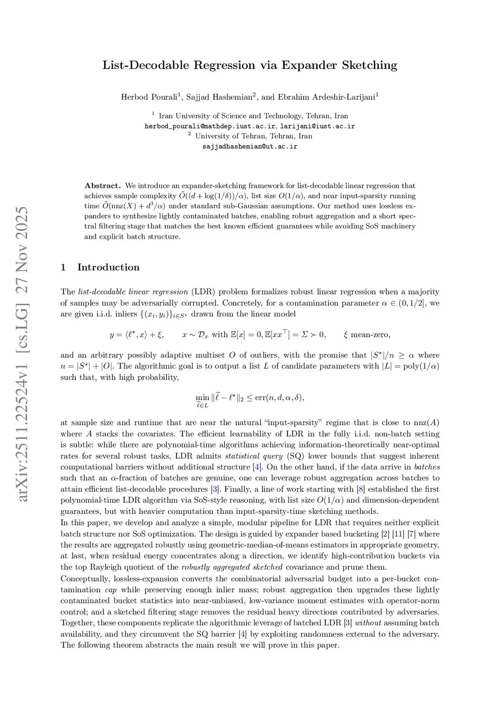 We introduce an expander-sketching framework for list-decodable linear regression that achieves sample complexity , list size , and near input-sparsity running time under standard sub-Gaussian assumptions. Our method uses lossless expanders to synthesize lightly contaminated batches, enabling robust aggregation and a short spectral filtering stage that matches the best known efficient guarantees while avoiding SoS machinery and explicit batch structure.