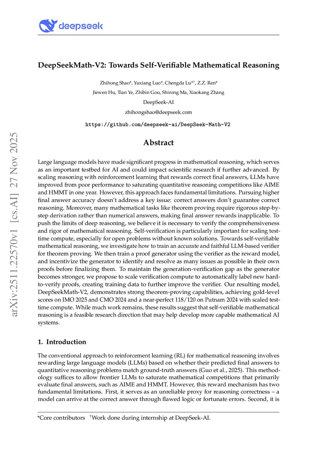 DeepSeekMath-V2: Towards Self-Verifiable Mathematical Reasoning
