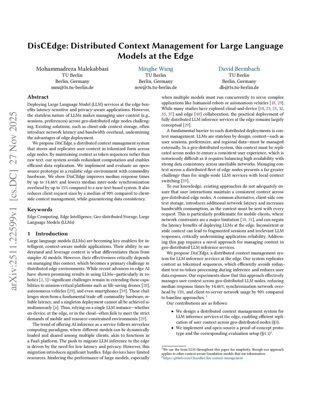 Deploying Large Language Model (LLM) services at the edge benefits latency-sensitive and privacy-aware applications. However, the stateless nature of LLMs makes managing user context (e.g., sessions, preferences) across geo-distributed edge nodes challenging. Existing solutions, such as client-side context storage, often introduce network latency and bandwidth overhead, undermining the advantages of edge deployment.We propose DisCEdge, a distributed context management system that stores and replicates user context in tokenized form across edge nodes. By maintaining context as token sequences rather than raw text, our system avoids redundant computation and enables efficient data replication. We implement and evaluate an open-source prototype in a realistic edge environment with commodity hardware. We show DisCEdge improves median response times by up to 14.46% and lowers median inter-node synchronization overhead by up to 15% compared to a raw-text-based system. It also reduces client request sizes by a median of 90% compared to client-side context management, while guaranteeing data consistency.