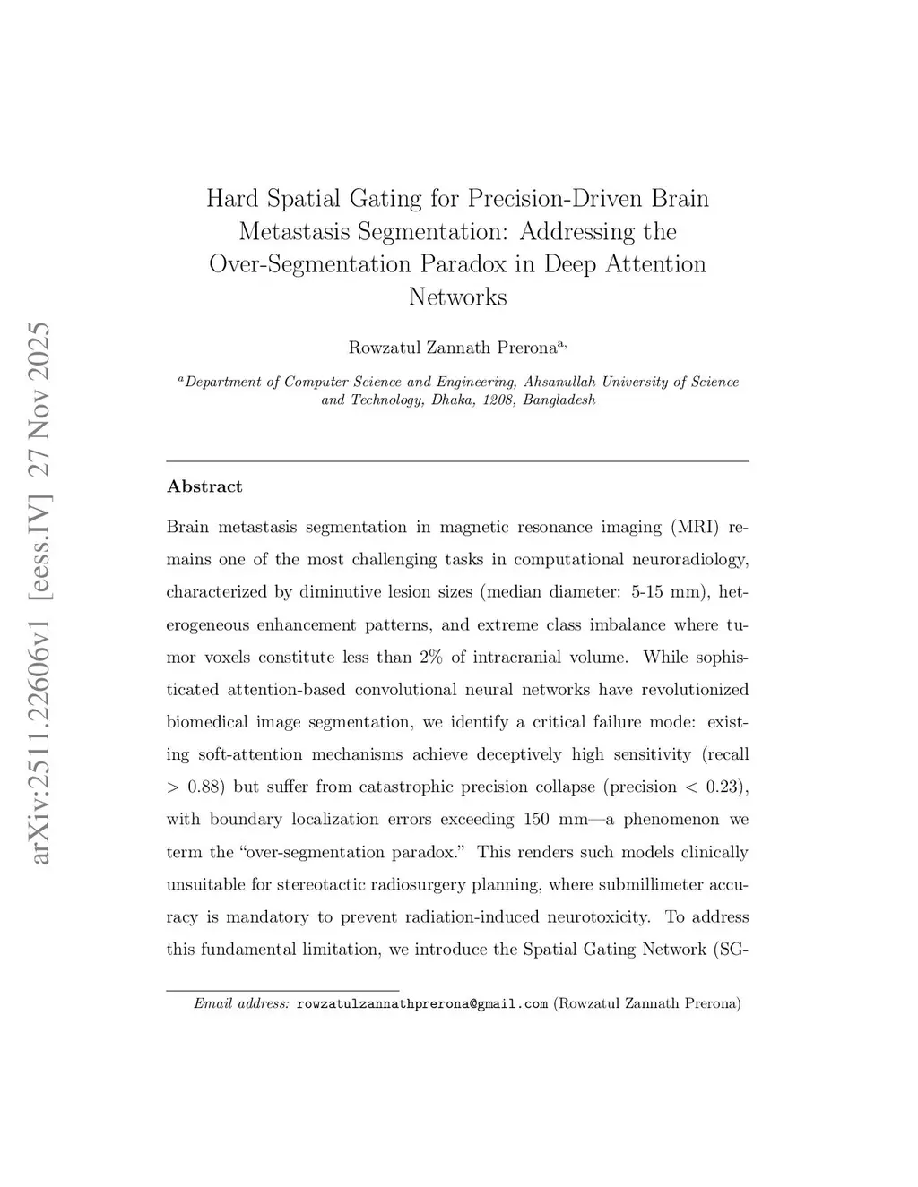 Brain metastasis segmentation in MRI remains a formidable challenge due to diminutive lesion sizes (5-15 mm) and extreme class imbalance (less than 2% tumor volume). While soft-attention CNNs are widely used, we identify a critical failure mode termed the "over-segmentation paradox," where models achieve high sensitivity (recall > 0.88) but suffer from catastrophic precision collapse (precision < 0.23) and boundary errors exceeding 150 mm. This imprecision poses significant risks for stereotactic radiosurgery planning. To address this, we introduce the Spatial Gating Network (SG-Net), a precision-first architecture employing hard spatial gating mechanisms. Unlike traditional soft attention, SG-Net enforces strict feature selection to aggressively suppress background artifacts while preserving tumor features. Validated on the Brain-Mets-Lung-MRI dataset (n=92), SG-Net achieves a Dice Similarity Coefficient of 0.5578 +/- 0.0243 (95% CI: 0.45-0.67), statistically outperforming Attention U-Net (p < 0.001) and ResU-Net (p < 0.001). Most critically, SG-Net demonstrates a threefold improvement in boundary precision, achieving a 95% Hausdorff Distance of 56.13 mm compared to 157.52 mm for Attention U-Net, while maintaining robust recall (0.79) and superior precision (0.52 vs. 0.20). Furthermore, SG-Net requires only 0.67M parameters (8.8x fewer than Attention U-Net), facilitating deployment in resource-constrained environments. These findings establish hard spatial gating as a robust solution for precision-driven lesion detection, directly enhancing radiosurgery accuracy.