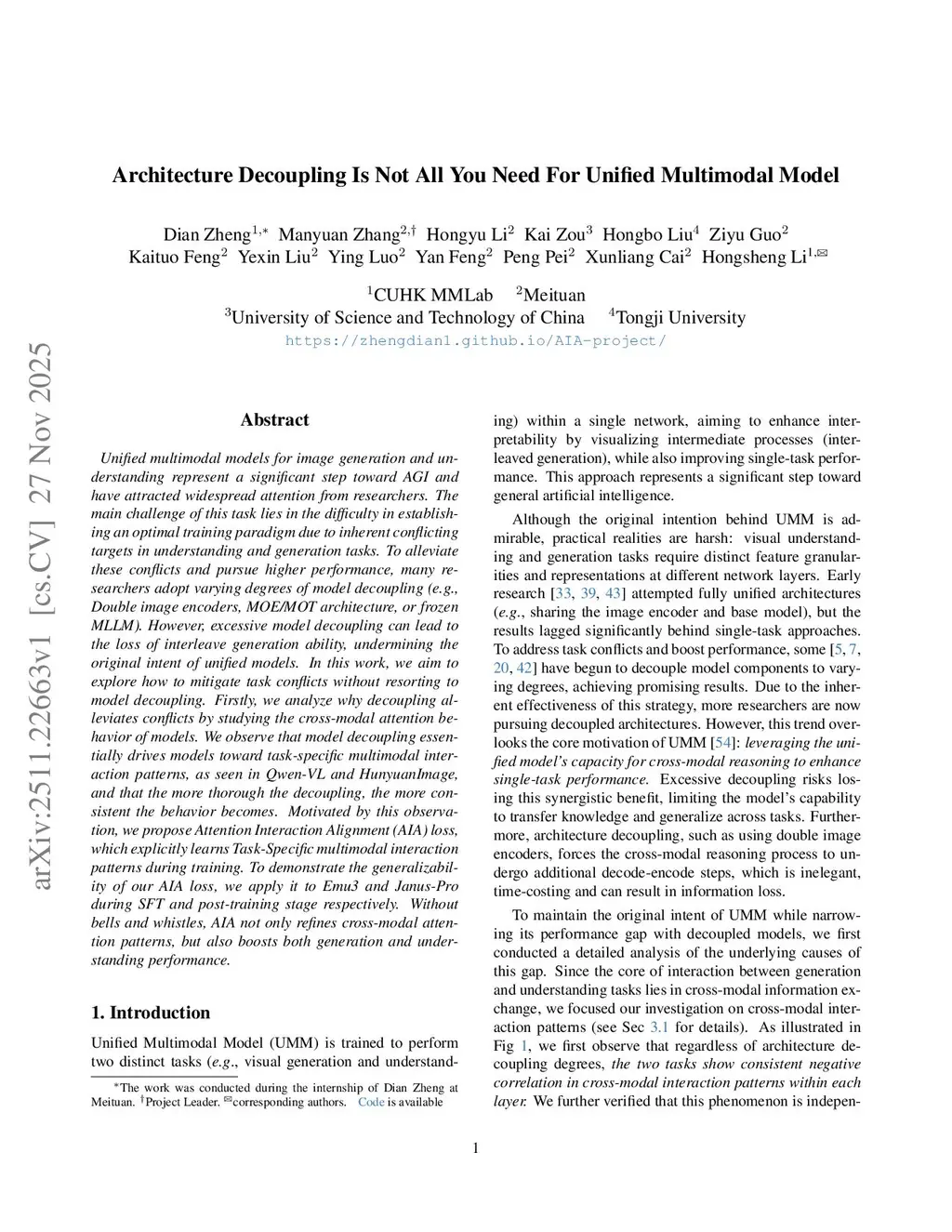 Unified multimodal models for image generation and understanding represent a significant step toward AGI and have attracted widespread attention from researchers. The main challenge of this task lies in the difficulty in establishing an optimal training paradigm due to inherent conflicting targets in understanding and generation tasks. To alleviate these conflicts and pursue higher performance, many researchers adopt varying degrees of architecture decoupling (e.g., Double image encoders, MOE/MOT architecture, or frozen MLLM). However, excessive model decoupling can lead to the loss of interleave generation ability, undermining the original intent of unified models. In this work, we aim to explore how to mitigate task conflicts without resorting to model decoupling. Firstly, we analyze why decoupling boosts performance by studying the cross-modal attention behavior of models. We observe that architecture decoupling does not solve task conflicts, but essentially drives models toward cross-modal interaction patterns of task-specific models, as seen in Qwen3-VL and HunyuanImage-3.0, and that the more thorough the decoupling, the more consistent the behavior becomes. Motivated by this observation, we propose Attention Interaction Alignment (AIA) loss, which explicitly learns task-specific multimodal interaction patterns during training. To demonstrate the generalizability of our AIA loss, we apply it to Emu3 and Janus-Pro during SFT and post-training stage respectively. Without bells and whistles, AIA not only refines cross-modal attention patterns, but also boosts both generation and understanding performance.