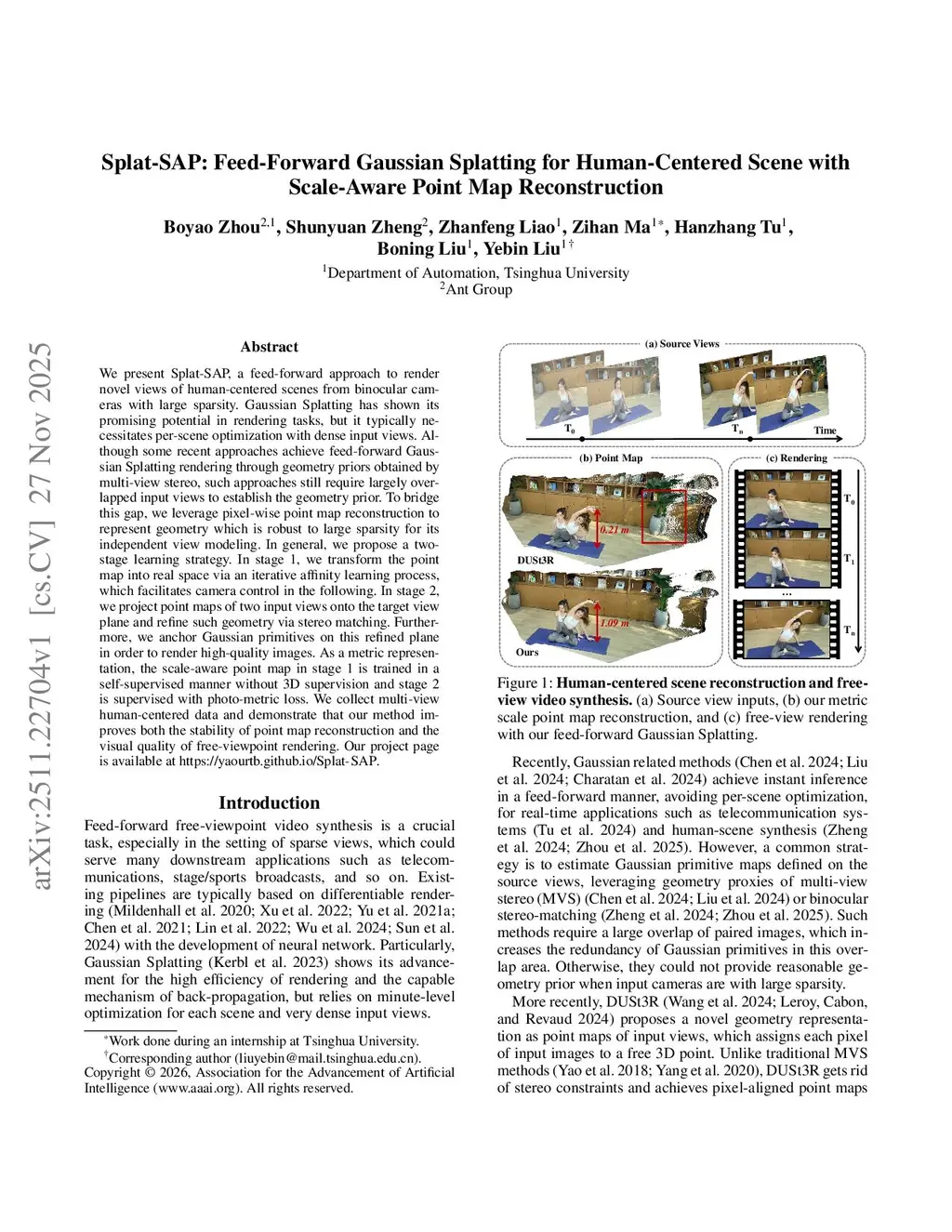 We present Splat-SAP, a feed-forward approach to render novel views of human-centered scenes from binocular cameras with large sparsity. Gaussian Splatting has shown its promising potential in rendering tasks, but it typically necessitates per-scene optimization with dense input views. Although some recent approaches achieve feed-forward Gaussian Splatting rendering through geometry priors obtained by multi-view stereo, such approaches still require largely overlapped input views to establish the geometry prior. To bridge this gap, we leverage pixel-wise point map reconstruction to represent geometry which is robust to large sparsity for its independent view modeling. In general, we propose a two-stage learning strategy. In stage 1, we transform the point map into real space via an iterative affinity learning process, which facilitates camera control in the following. In stage 2, we project point maps of two input views onto the target view plane and refine such geometry via stereo matching. Furthermore, we anchor Gaussian primitives on this refined plane in order to render high-quality images. As a metric representation, the scale-aware point map in stage 1 is trained in a self-supervised manner without 3D supervision and stage 2 is supervised with photo-metric loss. We collect multi-view human-centered data and demonstrate that our method improves both the stability of point map reconstruction and the visual quality of free-viewpoint rendering.
