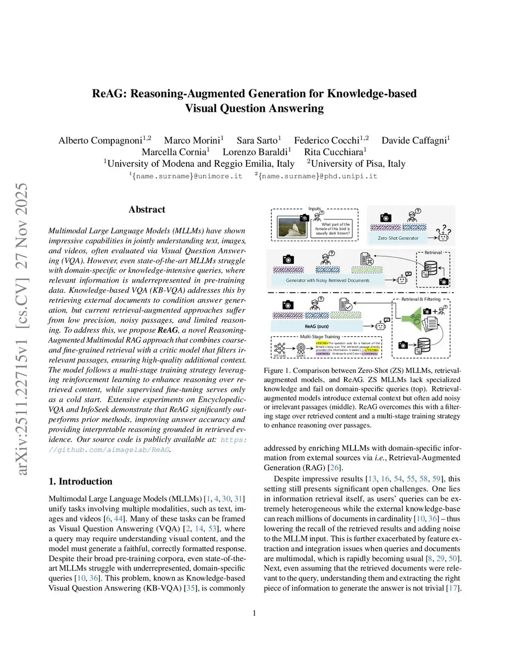 Multimodal Large Language Models (MLLMs) have shown impressive capabilities in jointly understanding text, images, and videos, often evaluated via Visual Question Answering (VQA). However, even state-of-the-art MLLMs struggle with domain-specific or knowledge-intensive queries, where relevant information is underrepresented in pre-training data. Knowledge-based VQA (KB-VQA) addresses this by retrieving external documents to condition answer generation, but current retrieval-augmented approaches suffer from low precision, noisy passages, and limited reasoning. To address this, we propose ReAG, a novel Reasoning-Augmented Multimodal RAG approach that combines coarse- and fine-grained retrieval with a critic model that filters irrelevant passages, ensuring high-quality additional context. The model follows a multi-stage training strategy leveraging reinforcement learning to enhance reasoning over retrieved content, while supervised fine-tuning serves only as a cold start. Extensive experiments on Encyclopedic-VQA and InfoSeek demonstrate that ReAG significantly outperforms prior methods, improving answer accuracy and providing interpretable reasoning grounded in retrieved evidence.
