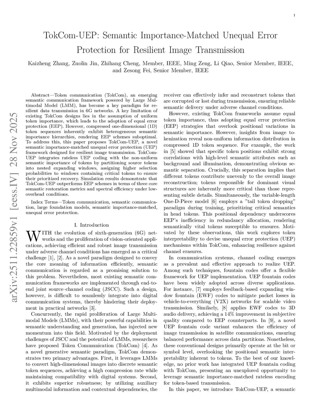 Based on the provided LaTeX code, here is the metadata for the submission form: Title: TokCom-UEP: Semantic Importance-Matched Unequal Error Protection for Resilient Image Transmission Author(s): Kaizheng Zhang, Zuolin Jin, Zhihang Cheng, Ming Zeng, Li Qiao, Zesong Fei Abstract: Token communication (TokCom), an emerging semantic communication framework powered by Large Multimodal Model (LMM), has become a key paradigm for resilient data transmission in 6G networks. A key limitation of existing TokCom designs lies in the assumption of uniform token importance, which leads to the adoption of equal error protection (EEP). However, compressed one-dimensional (1D) token sequences inherently exhibit heterogeneous semantic importance hierarchies, rendering EEP schemes suboptimal. To address this, this paper proposes TokCom-UEP, a novel semantic importance-matched unequal error protection (UEP) framework designed for resilient image transmission. TokCom-UEP integrates rateless UEP coding with the non-uniform semantic importance of tokens by partitioning source tokens into nested expanding windows, assigning higher selection probabilities to windows containing critical tokens to ensure their prioritized recovery. Simulation results demonstrate that TokCom-UEP outperforms EEP schemes in terms of three core semantic restoration metrics and spectral efficiency under low-overhead conditions.