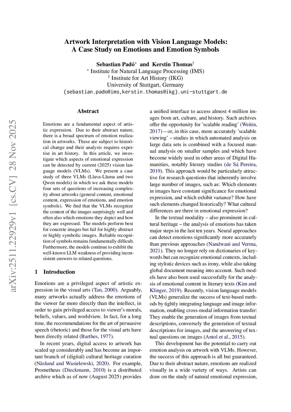 Emotions are a fundamental aspect of artistic expression. Due to their abstract nature, there is a broad spectrum of emotion realization in artworks. These are subject to historical change and their analysis requires expertise in art history. In this article, we investigate which aspects of emotional expression can be detected by current (2025) vision language models (VLMs). We present a case study of three VLMs (Llava-Llama and two Qwen models) in which we ask these models four sets of questions of increasing complexity about artworks (general content, emotional content, expression of emotions, and emotion symbols) and carry out a qualitative expert evaluation. We find that the VLMs recognize the content of the images surprisingly well and often also which emotions they depict and how they are expressed. The models perform best for concrete images but fail for highly abstract or highly symbolic images. Reliable recognition of symbols remains fundamentally difficult. Furthermore, the models continue to exhibit the well-known LLM weakness of providing inconsistent answers to related questions.