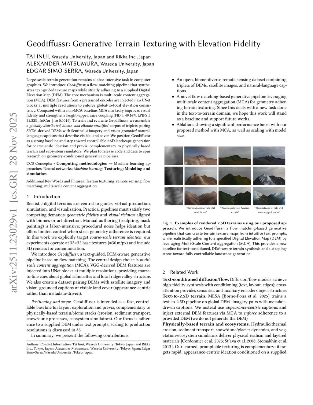 Large-scale terrain generation remains a labor-intensive task in computer graphics. We introduce Geodiffussr, a flow-matching pipeline that synthesizes text-guided texture maps while strictly adhering to a supplied Digital Elevation Map (DEM). The core mechanism is multi-scale content aggregation (MCA): DEM features from a pretrained encoder are injected into UNet blocks at multiple resolutions to enforce global-to-local elevation consistency. Compared with a non-MCA baseline, MCA markedly improves visual fidelity and strengthens height-appearance coupling (FID 49.16%, LPIPS 32.33%, dCor to 0.0016). To train and evaluate Geodiffussr, we assemble a globally distributed, biome- and climate-stratified corpus of triplets pairing SRTM-derived DEMs with Sentinel-2 imagery and vision-grounded natural-language captions that describe visible land cover. We position Geodiffussr as a strong baseline and step toward controllable 2.5D landscape generation for coarse-scale ideation and previz, complementary to physically based terrain and ecosystem simulators.