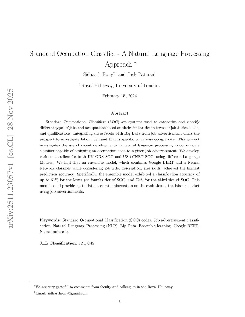 Standard Occupational Classifiers (SOC) are systems used to categorize and classify different types of jobs and occupations based on their similarities in terms of job duties, skills, and qualifications. Integrating these facets with Big Data from job advertisement offers the prospect to investigate labour demand that is specific to various occupations. This project investigates the use of recent developments in natural language processing to construct a classifier capable of assigning an occupation code to a given job advertisement. We develop various classifiers for both UK ONS SOC and US O*NET SOC, using different Language Models. We find that an ensemble model, which combines Google BERT and a Neural Network classifier while considering job title, description, and skills, achieved the highest prediction accuracy. Specifically, the ensemble model exhibited a classification accuracy of up to 61% for the lower (or fourth) tier of SOC, and 72% for the third tier of SOC. This model could provide up to date, accurate information on the evolution of the labour market using job advertisements.