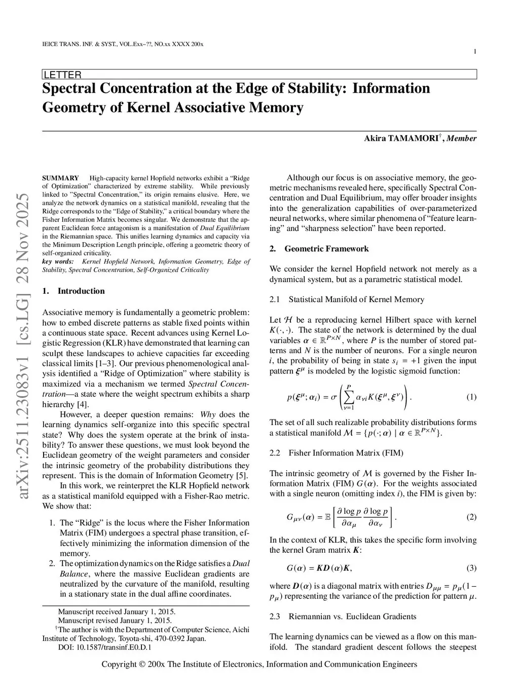 Spectral Concentration at the Edge of Stability: Information Geometry of Kernel Associative Memory