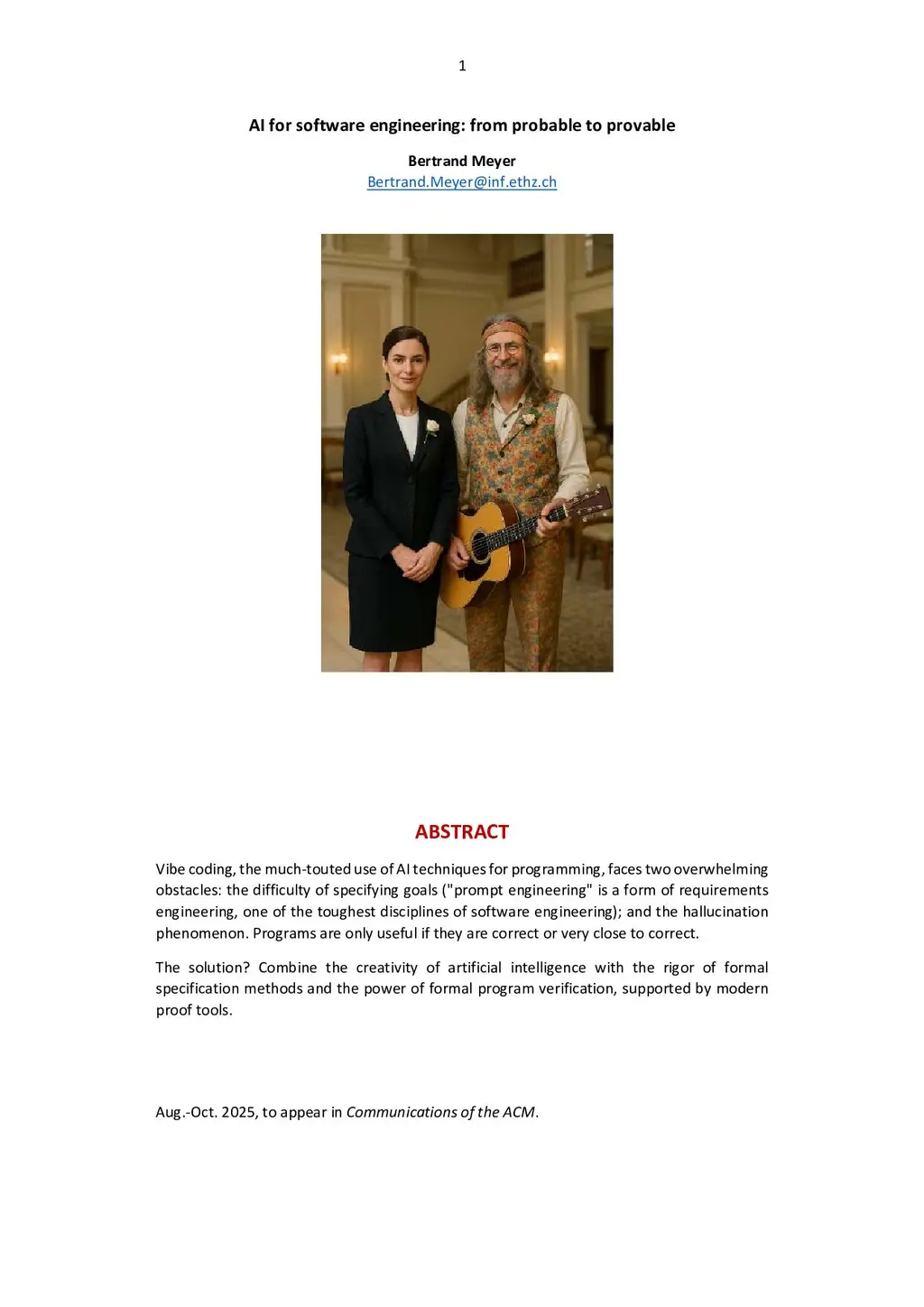 Vibe coding, the much-touted use of AI techniques for programming, faces two overwhelming obstacles: the difficulty of specifying goals ("prompt engineering" is a form of requirements engineering, one of the toughest disciplines of software engineering); and the hallucination phenomenon. Programs are only useful if they are correct or very close to correct.The solution? Combine the creativity of artificial intelligence with the rigor of formal specification methods and the power of formal program verification, supported by modern proof tools.