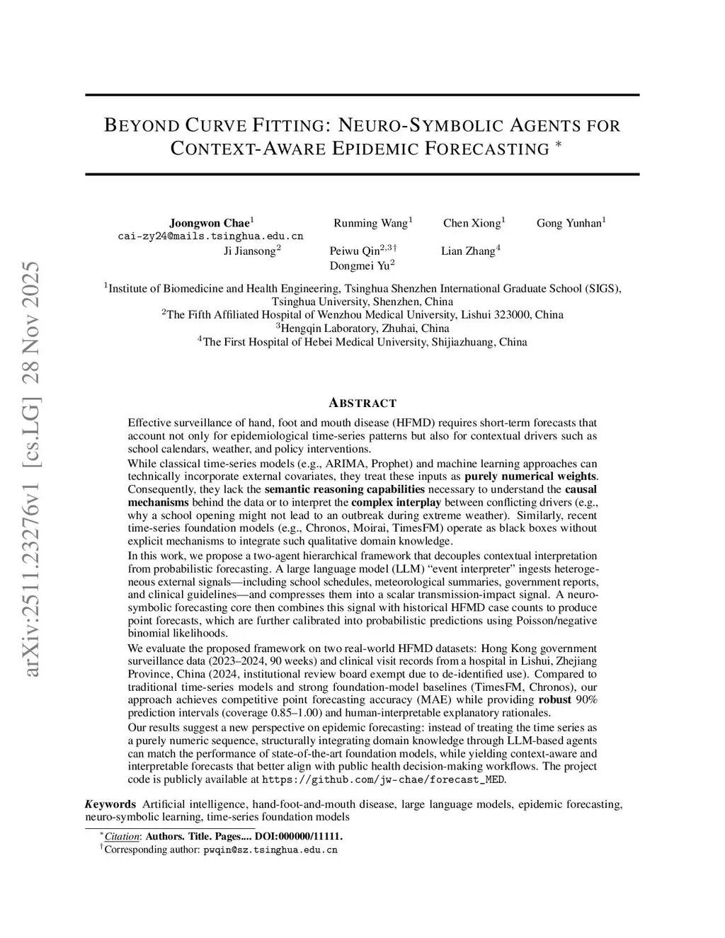 Effective surveillance of hand, foot and mouth disease (HFMD) requires forecasts accounting for epidemiological patterns and contextual drivers like school calendars and weather. While classical models and recent foundation models (e.g., Chronos, TimesFM) incorporate covariates, they often lack the semantic reasoning to interpret the causal interplay between conflicting drivers. In this work, we propose a two-agent framework decoupling contextual interpretation from probabilistic forecasting. An LLM "event interpreter" processes heterogeneous signals-including school schedules, meteorological summaries, and reports-into a scalar transmission-impact signal. A neuro-symbolic core then combines this with historical case counts to produce calibrated probabilistic forecasts. We evaluate the framework on real-world HFMD datasets from Hong Kong (2023-2024) and Lishui, China (2024). Compared to traditional and foundation-model baselines, our approach achieves competitive point forecasting accuracy while providing robust 90% prediction intervals (coverage 0.85-1.00) and human-interpretable rationales. Our results suggest that structurally integrating domain knowledge through LLMs can match state-of-the-art performance while yielding context-aware forecasts that align with public health workflows. Code is available atthis https URL.