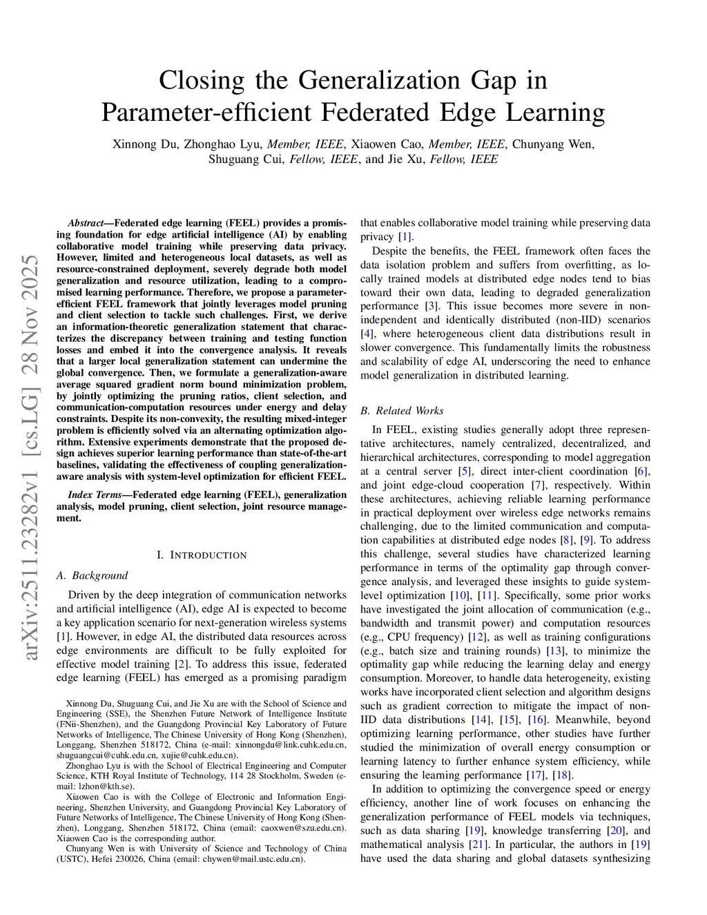 Federated edge learning (FEEL) provides a promising foundation for edge artificial intelligence (AI) by enabling collaborative model training while preserving data privacy. However, limited and heterogeneous local datasets, as well as resource-constrained deployment, severely degrade both model generalization and resource utilization, leading to a compromised learning performance. Therefore, we propose a parameter-efficient FEEL framework that jointly leverages model pruning and client selection to tackle such challenges. First, we derive an information-theoretic generalization statement that characterizes the discrepancy between training and testing function losses and embed it into the convergence analysis. It reveals that a larger local generalization statement can undermine the global convergence. Then, we formulate a generalization-aware average squared gradient norm bound minimization problem, by jointly optimizing the pruning ratios, client selection, and communication-computation resources under energy and delay constraints. Despite its non-convexity, the resulting mixed-integer problem is efficiently solved via an alternating optimization algorithm. Extensive experiments demonstrate that the proposed design achieves superior learning performance than state-of-the-art baselines, validating the effectiveness of coupling generalization-aware analysis with system-level optimization for efficient FEEL.