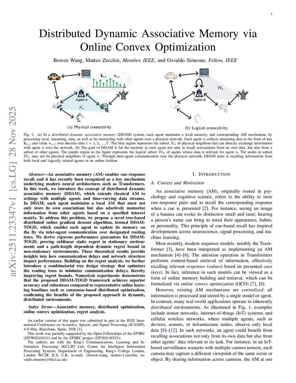 Distributed Dynamic Associative Memory via Online Convex Optimization